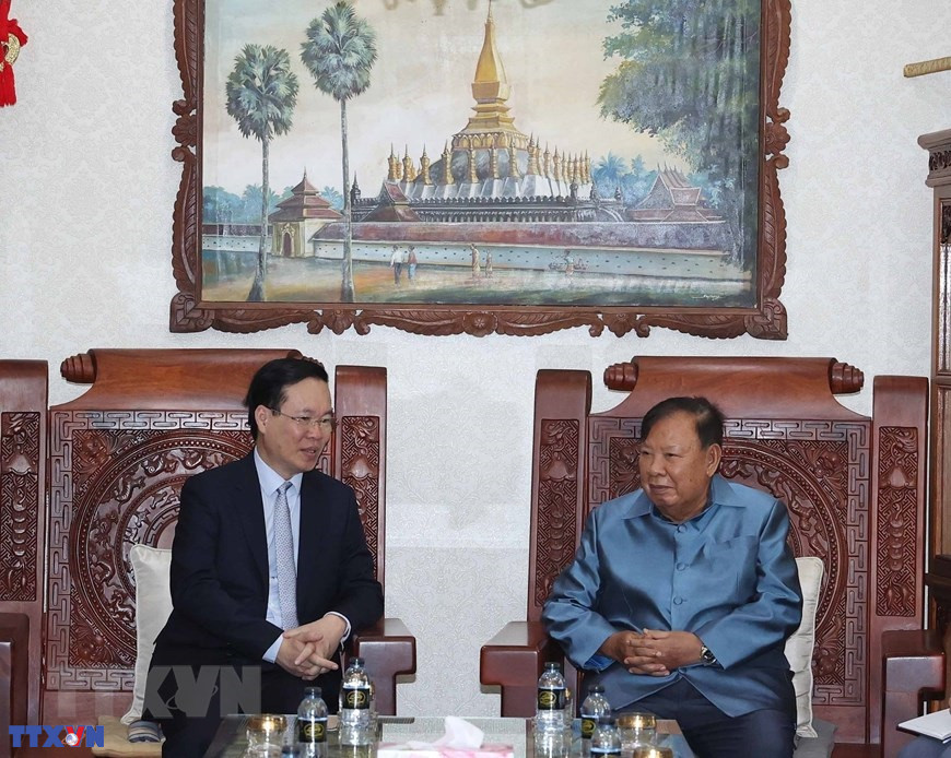 Chủ tịch nước Võ Văn Thưởng thăm nguyên Tổng Bí thư, Chủ tịch nước Lào Bounnhang Vorachith. (Ảnh: Thống Nhất/TTXVN)