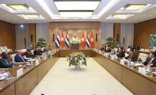 Tổng Bí thư Nguyễn Phú Trọng và Chủ tịch Quốc hội Cuba Esteban Lazo Hernandez cùng các đại biểu. Ảnh: Trí Dũng - TTXVN