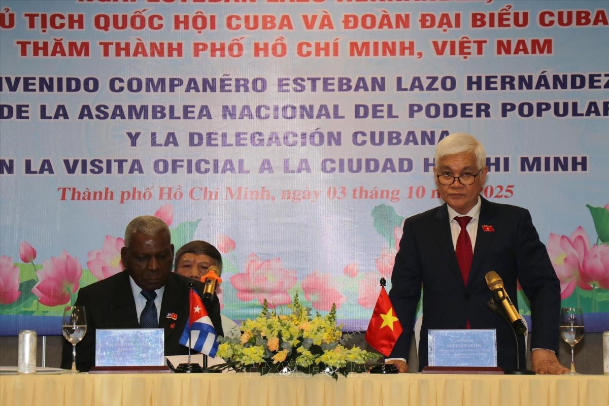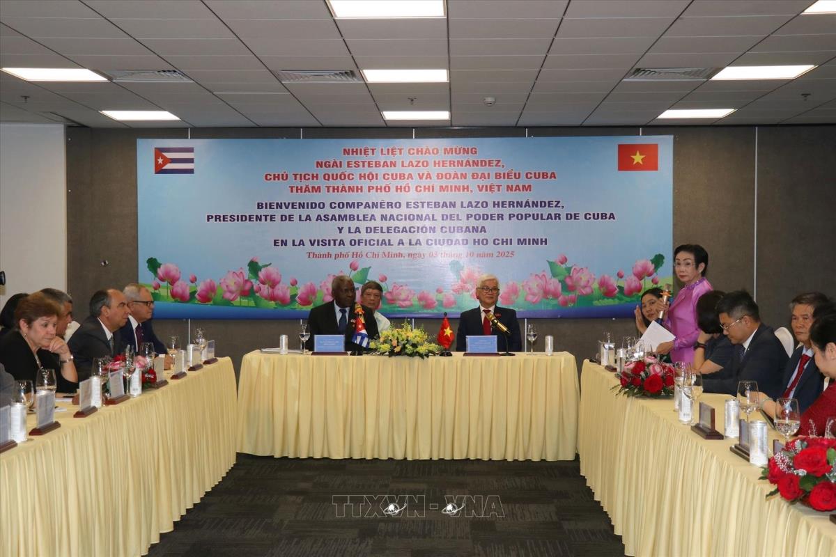 Chủ tịch Quốc hội Cuba Esteban Lazo Hernandez với ông Nguyễn Văn Lợi, Trưởng Đoàn đại biểu Quốc hội Thành phố Hồ Chí Minh tại buổi làm việc với Liên hiệp các tổ chức hữu nghị Thành phố Hồ Chí Minh (HUFO) (3/10/2025). Ảnh: Thanh Vũ-TTXVN