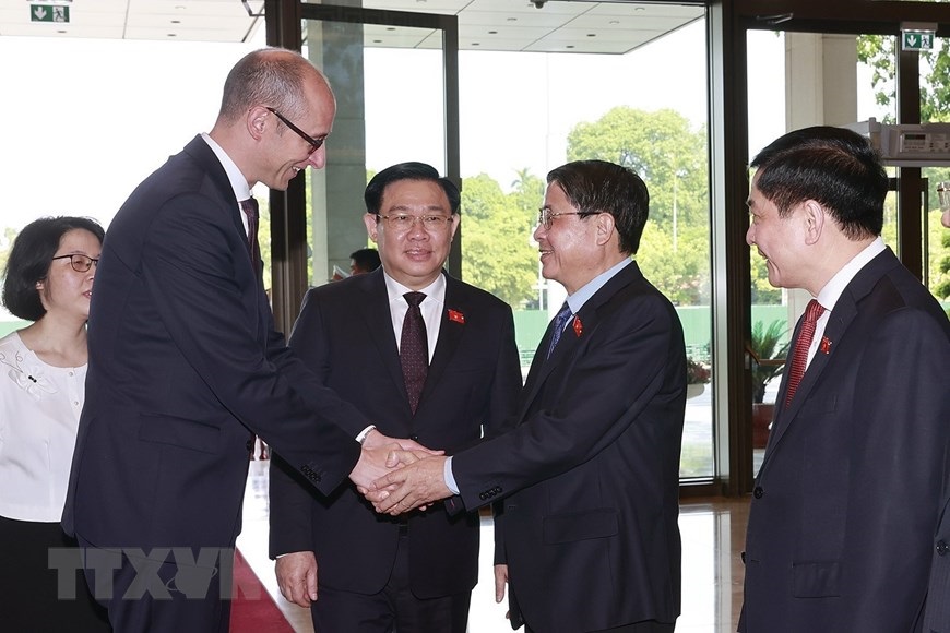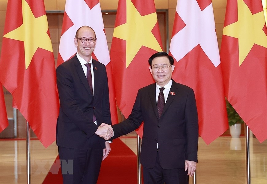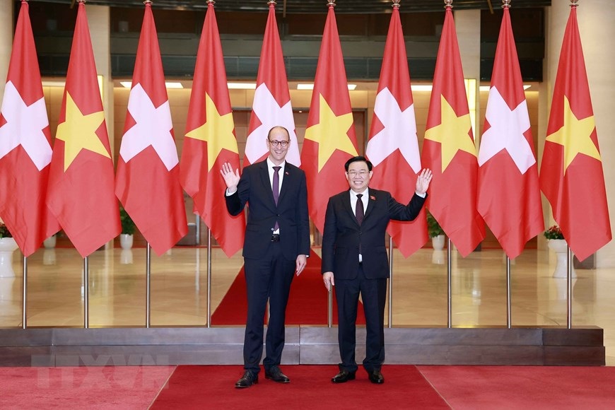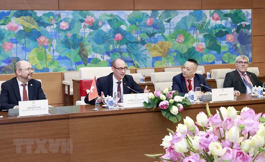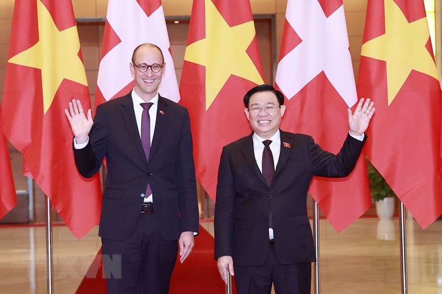 Chủ tịch Quốc hội Vương Đình Huệ với Chủ tịch Hội đồng Quốc gia Thụy Sĩ Martin Candinas. (Ảnh: Doãn Tấn/TTXVN)