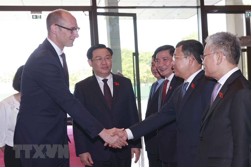 Chủ tịch Quốc hội Vương Đình Huệ đón Chủ tịch Hội đồng Quốc gia Thụy Sĩ Martin Candinas. (Ảnh: Doãn Tấn/TTXVN)