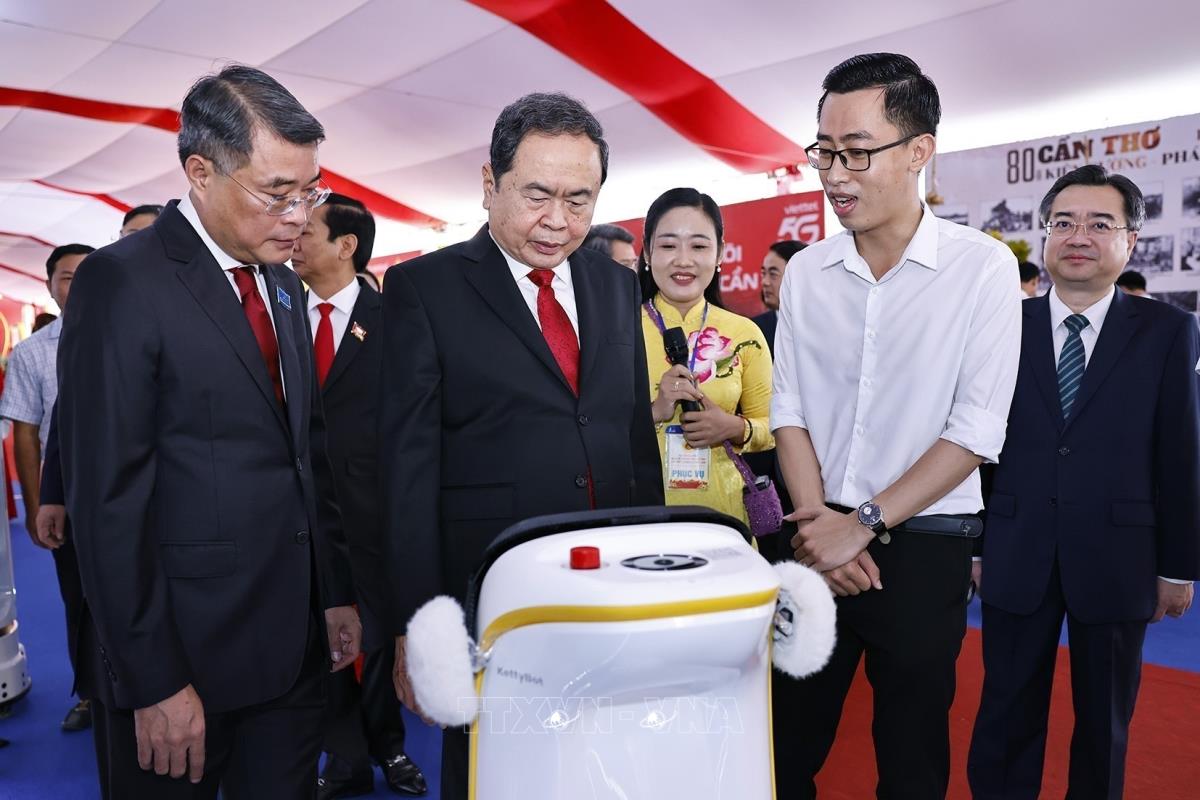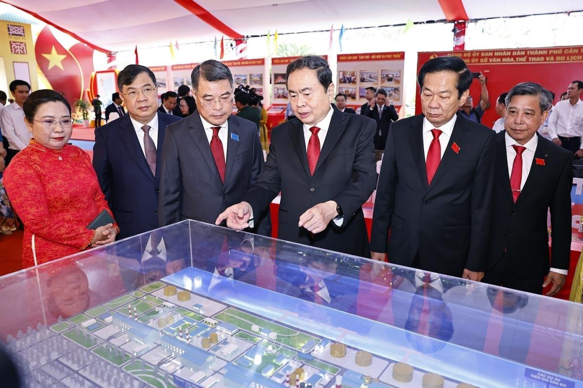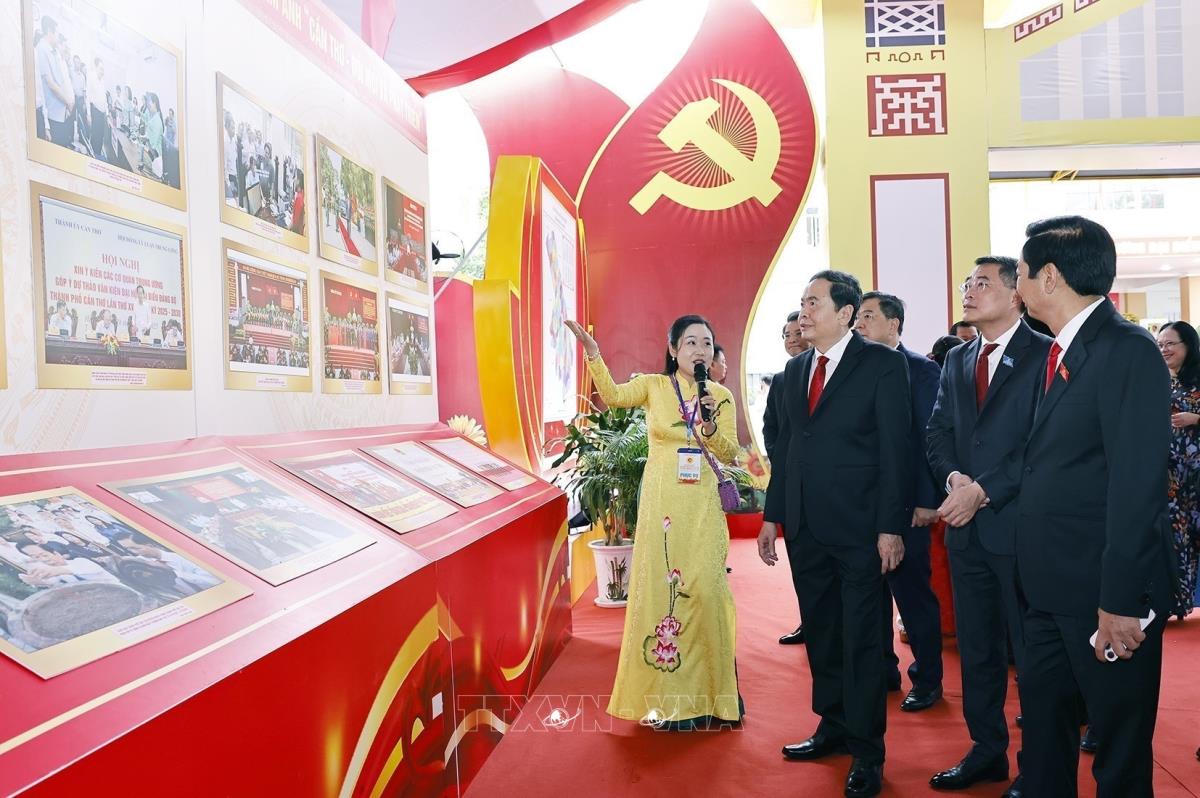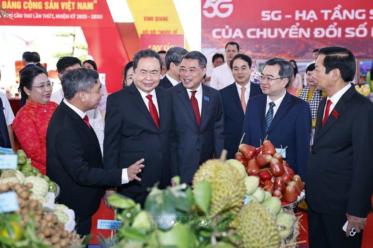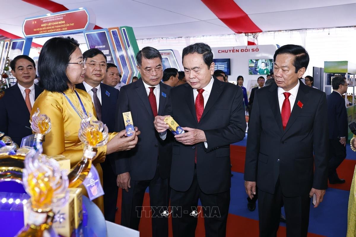 Chủ tịch Quốc hội Trần Thanh Mẫn và đại biểu tham quan gian trưng bày thành tựu của thành phố Cần Thơ tại Đại hội (27/9/2025). Ảnh: Doãn Tấn - TTXVN