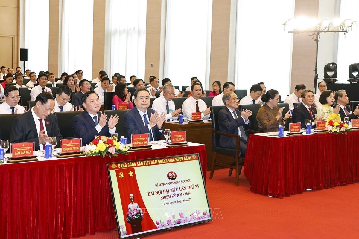 Chủ tịch Quốc hội Trần Thanh Mẫn và đại biểu dự Đại hội đại biểu Đảng bộ Văn phòng Quốc hội lần thứ XV (16/7/2025). Ảnh: Doãn Tấn - TTXVN