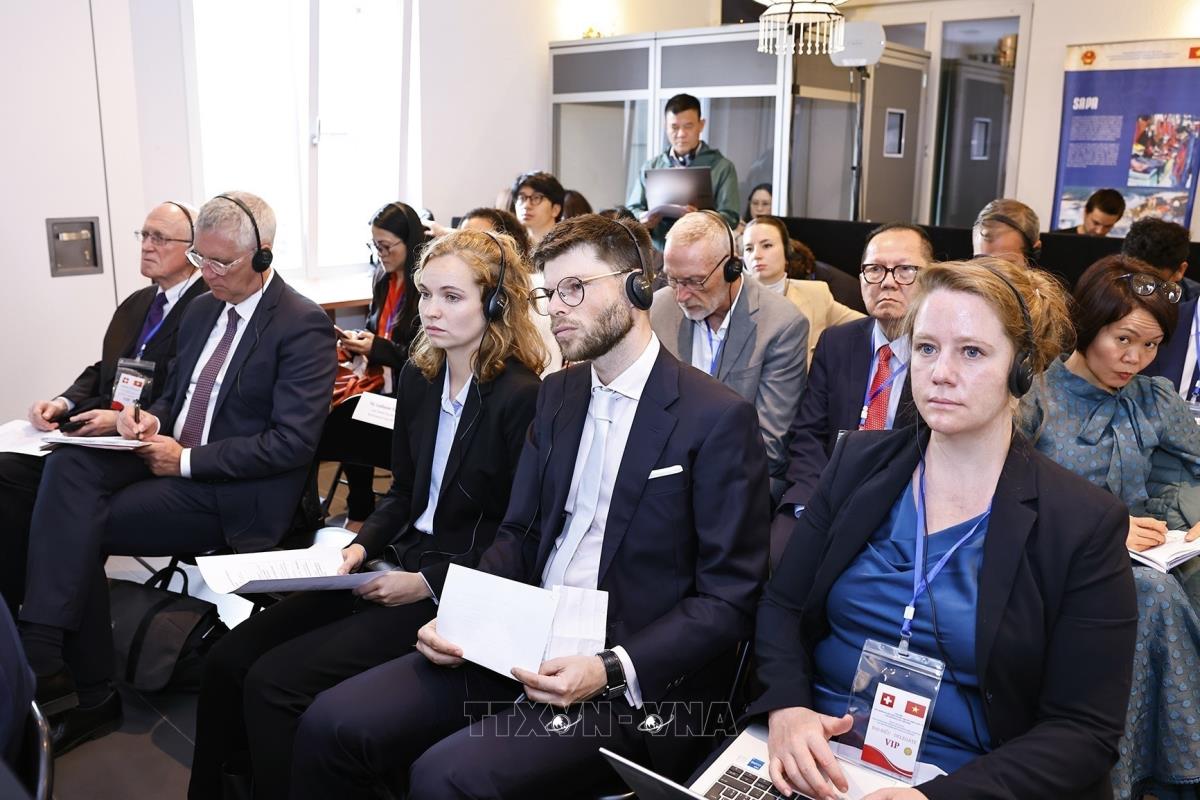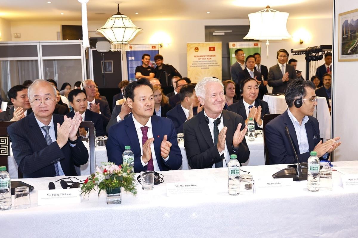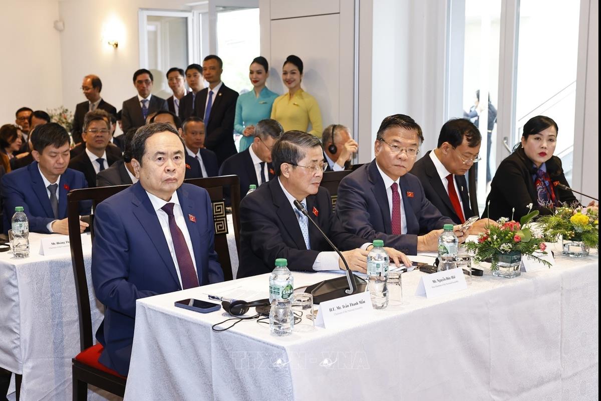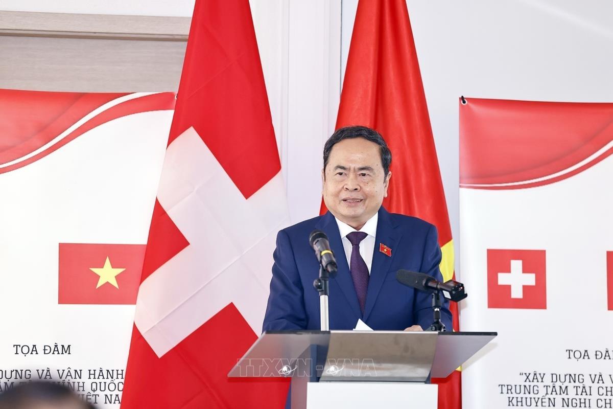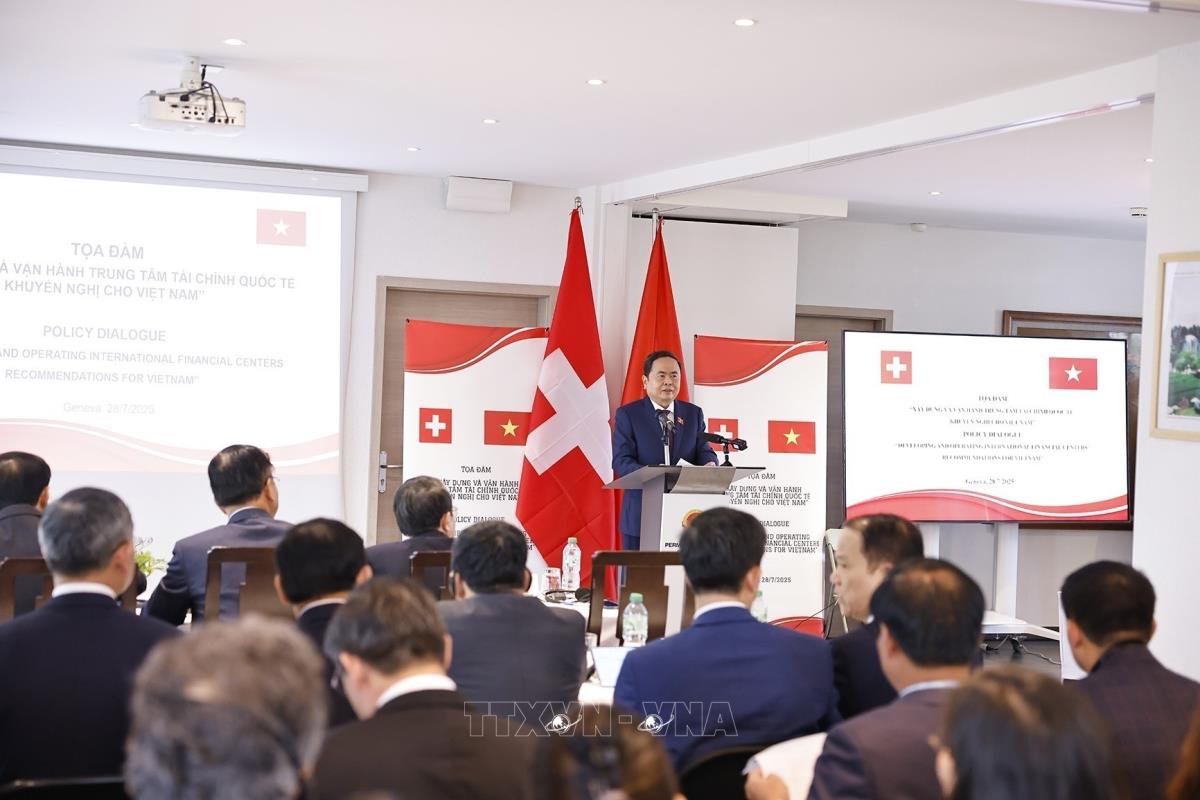 Hà Nội (TTXVN 28/7/2025) Trong khuôn khổ chương trình tham dự Hội nghị các Chủ tịch Quốc hội thế giới lần thứ 6, tiến hành các hoạt động song phương tại Thụy Sĩ, sáng 28/7/2025 (giờ địa phương), tại Geneva, Chủ tịch Quốc hội Trần Thanh Mẫn dự và phát biểu khai mạc Tọa đàm "Xây dựng và vận hành Trung tâm tài chính quốc tế và khuyến nghị cho Việt Nam".