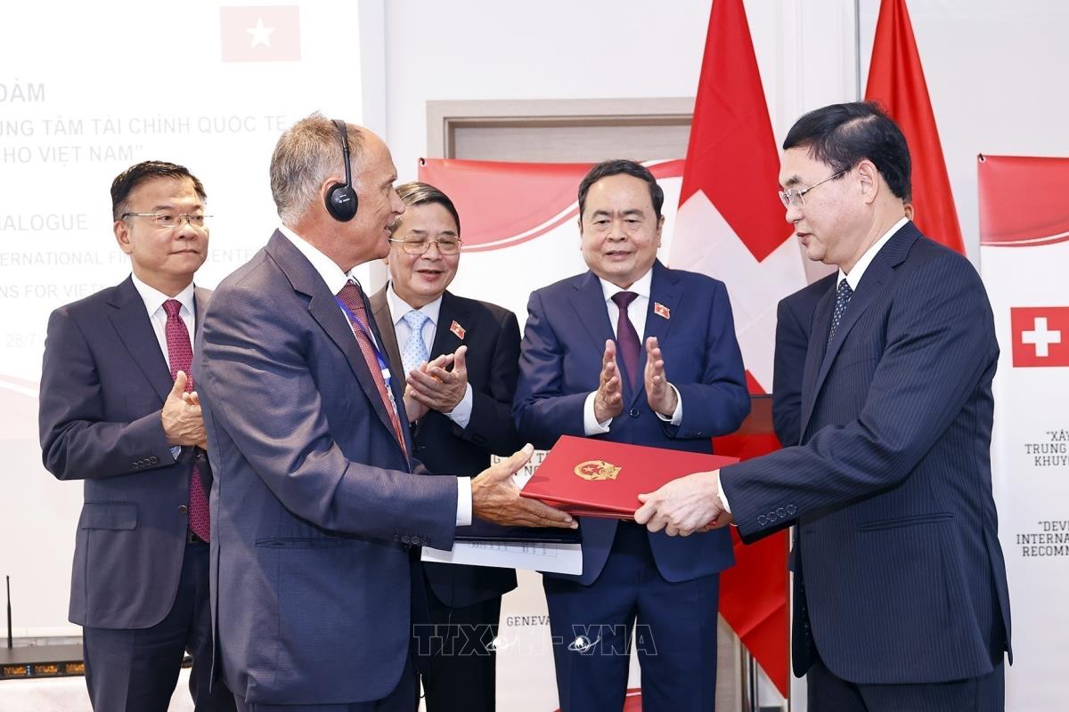 Chủ tịch Quốc hội Trần Thanh Mẫn chứng kiến Lễ trao biên bản ghi nhớ hợp tác giữa Bộ Tài chính Việt Nam (MOF) và Diễn đàn Kinh tế Thụy Sĩ - Việt Nam (SVEF) (28/7/2025). Ảnh: Doãn Tấn – TTXVN