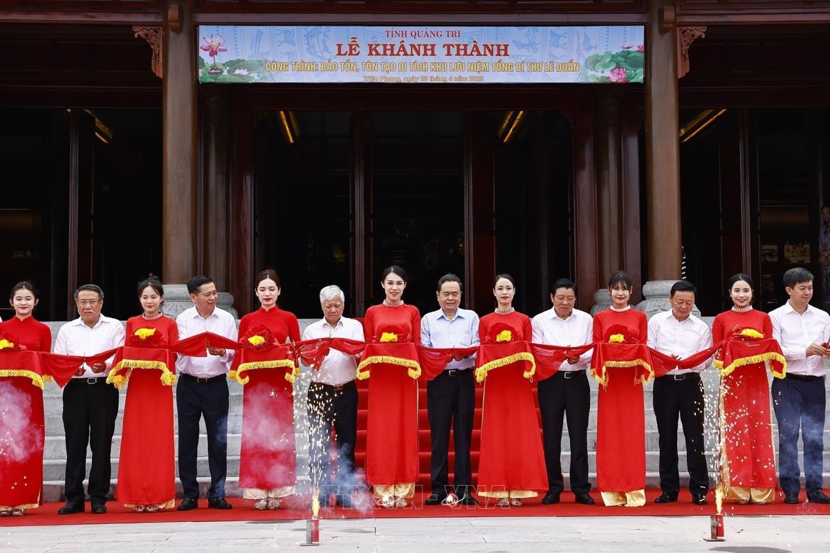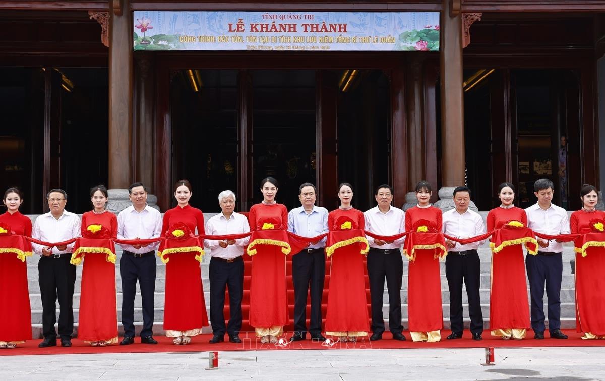 Chủ tịch Quốc hội Trần Thanh Mẫn và đại biểu cắt băng khánh thành Khu lưu niệm Tổng Bí thư Lê Duẩn tại Quảng Trị (28/4/2025). Ảnh: Doãn Tấn - TTXVN