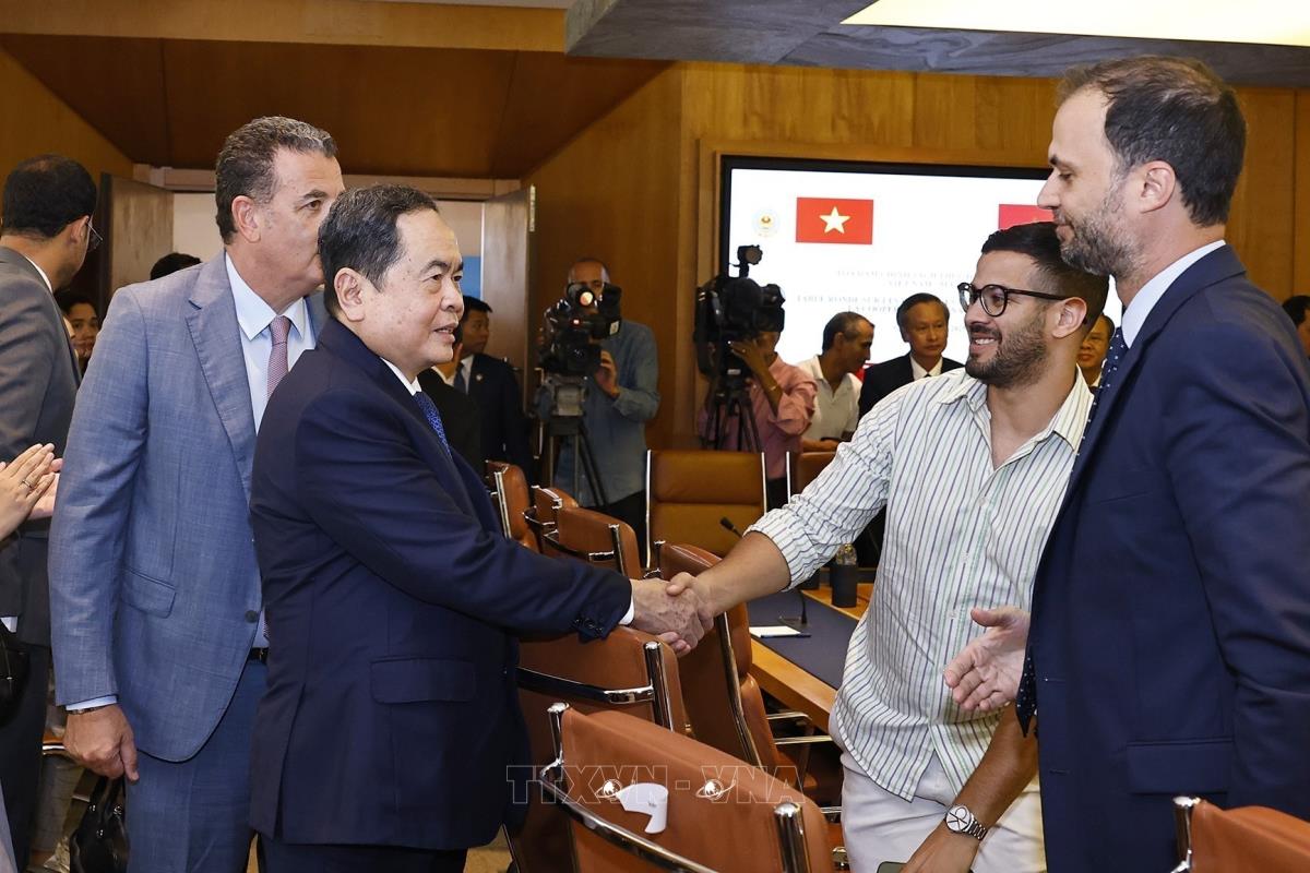 Chủ tịch Quốc hội Trần Thanh Mẫn với đại biểu Maroc dự Tọa đàm chính sách thúc đẩy hợp tác kinh tế, thương mại và đầu tư Việt Nam – Maroc (chiều 25/7/2025, giờ địa phương). Ảnh: Doãn Tấn – TTXVN