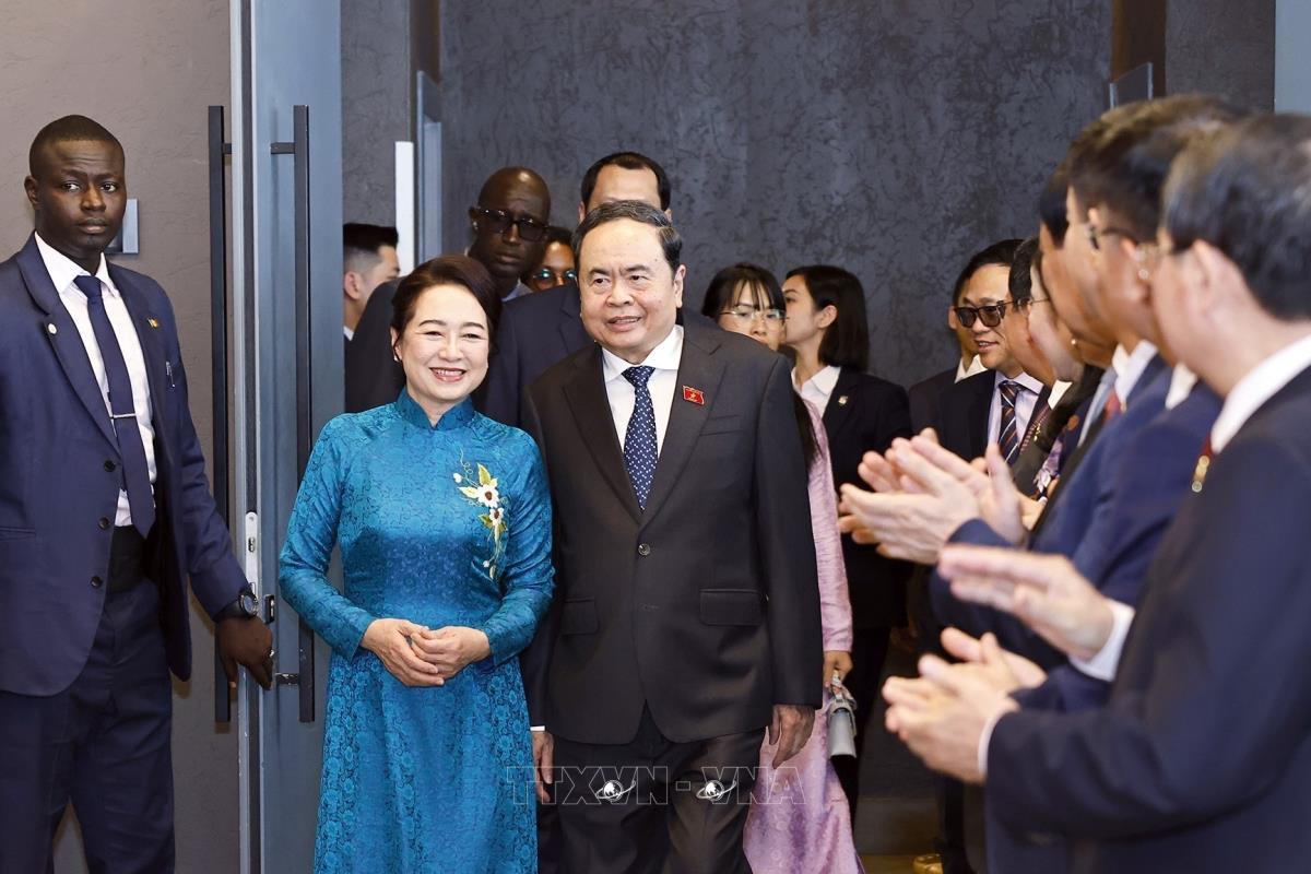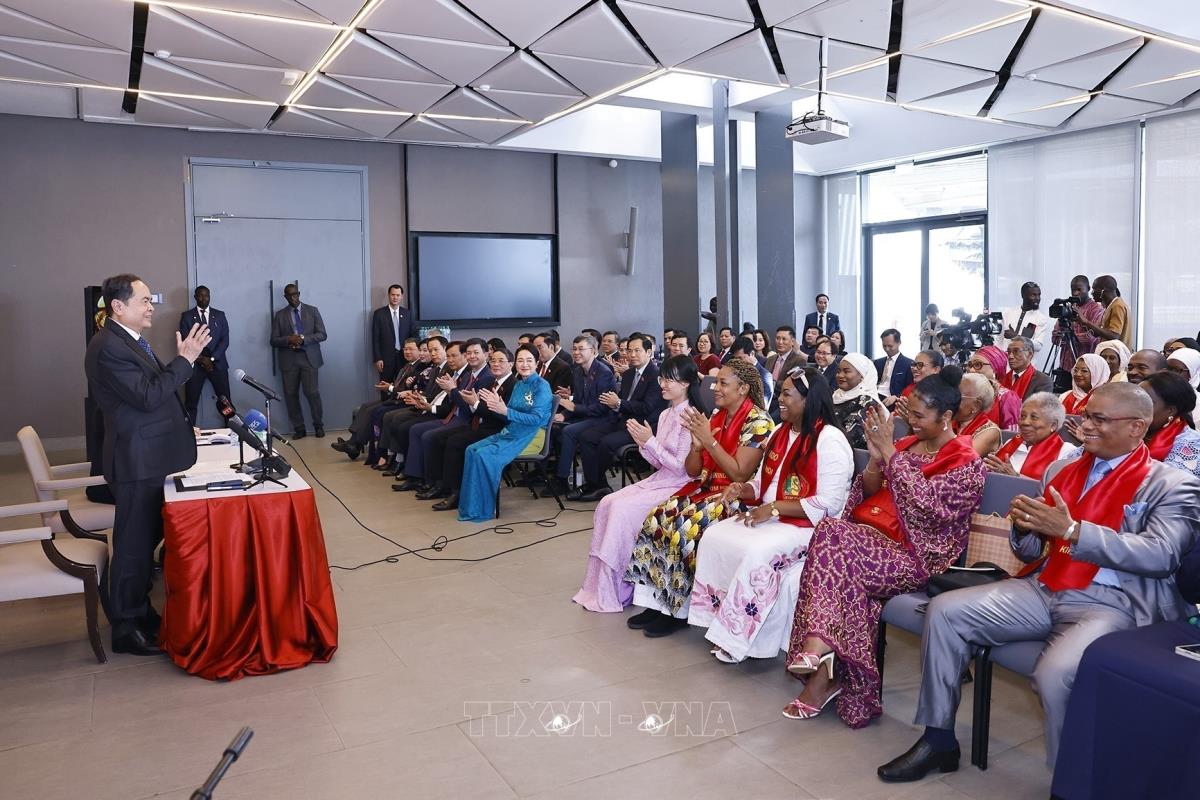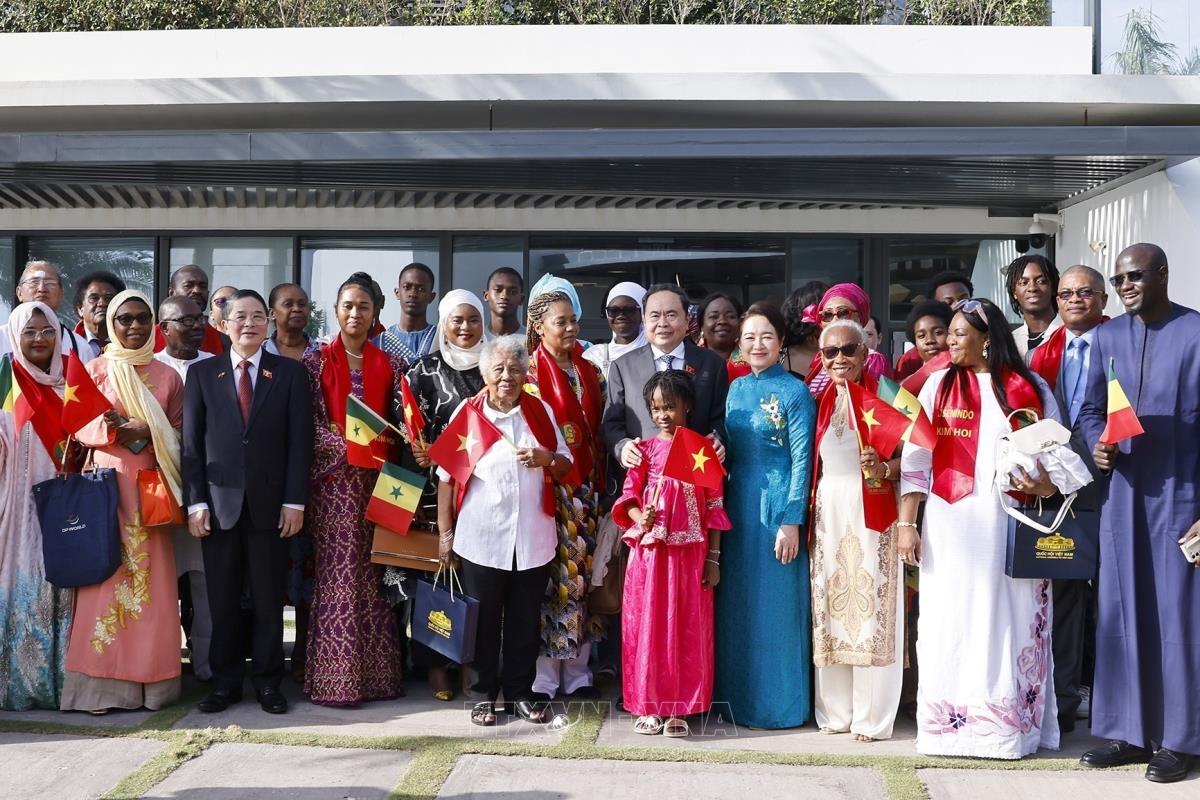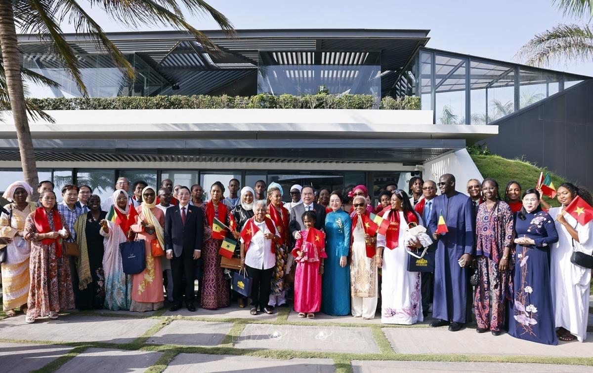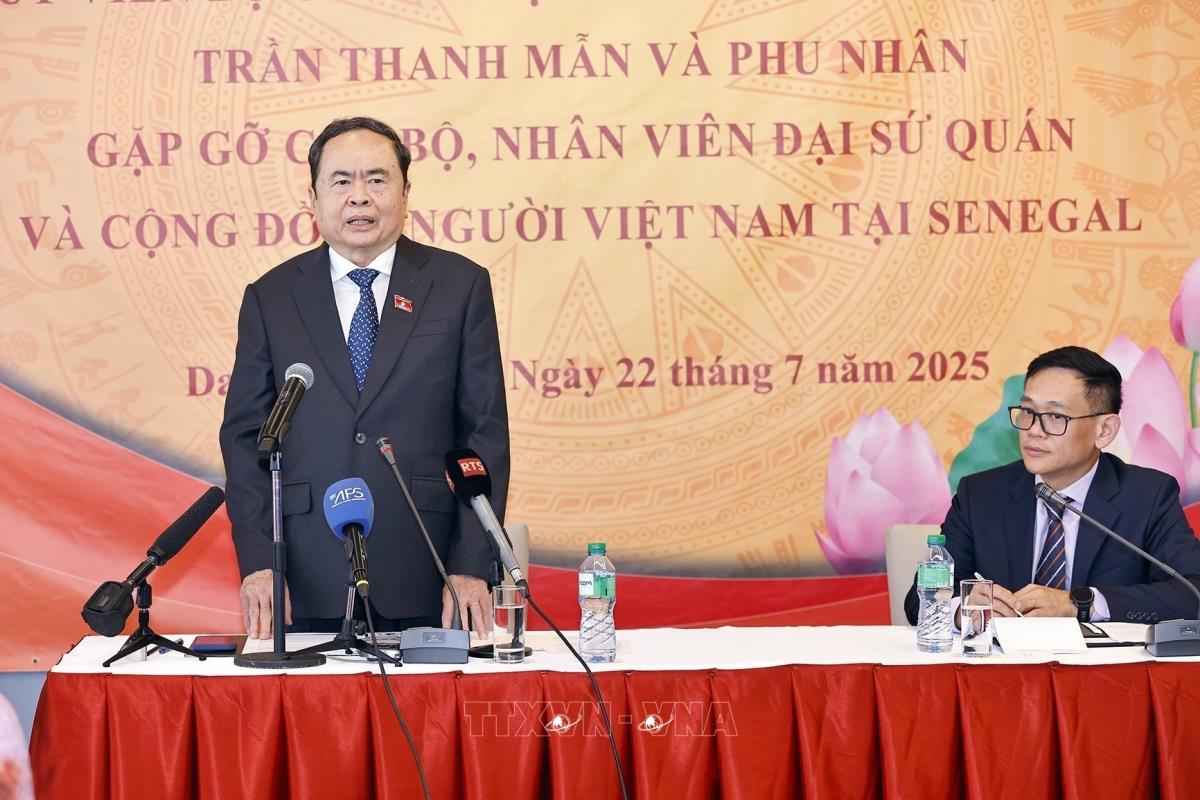 Chủ tịch Quốc hội Trần Thanh Mẫn và Phu nhân gặp gỡ cán bộ Đại sứ quán, cộng đồng người Việt Nam tại Senegal (chiều 22/7/2025, giờ địa phương). Ảnh: Doãn Tấn – TTXVN