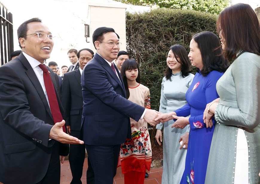 Cán bộ, nhân viên Đại sứ quán và cộng đồng người Việt tại Vương quốc Anh đón Chủ tịch Quốc hội Vương Đình Huệ. (Ảnh: Doãn Tấn/TTXVN)