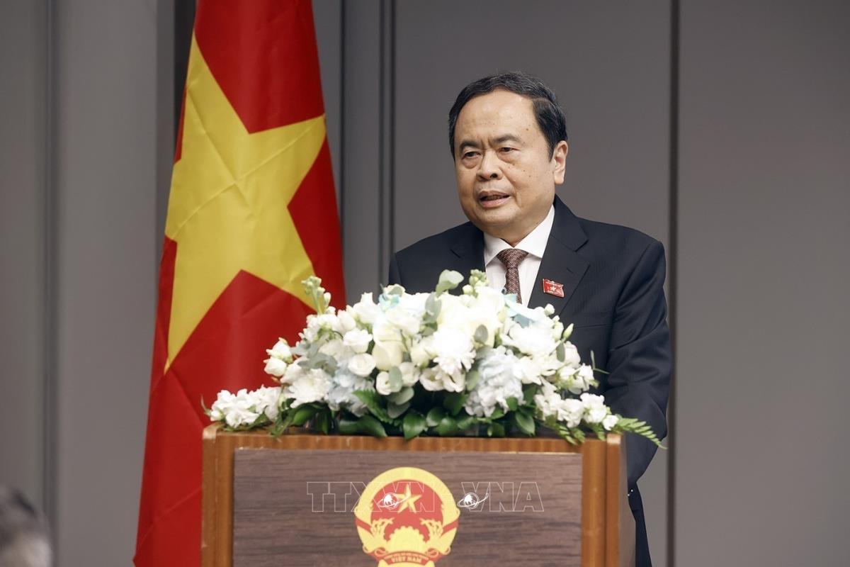 Chủ tịch Quốc hội Trần Thanh Mẫn gặp gỡ đại diện cán bộ Đại sứ quán và đại diện cộng đồng người Việt Nam tại Uzbekistan (8/4/2025). Ảnh: Doãn Tấn – TTXVN
