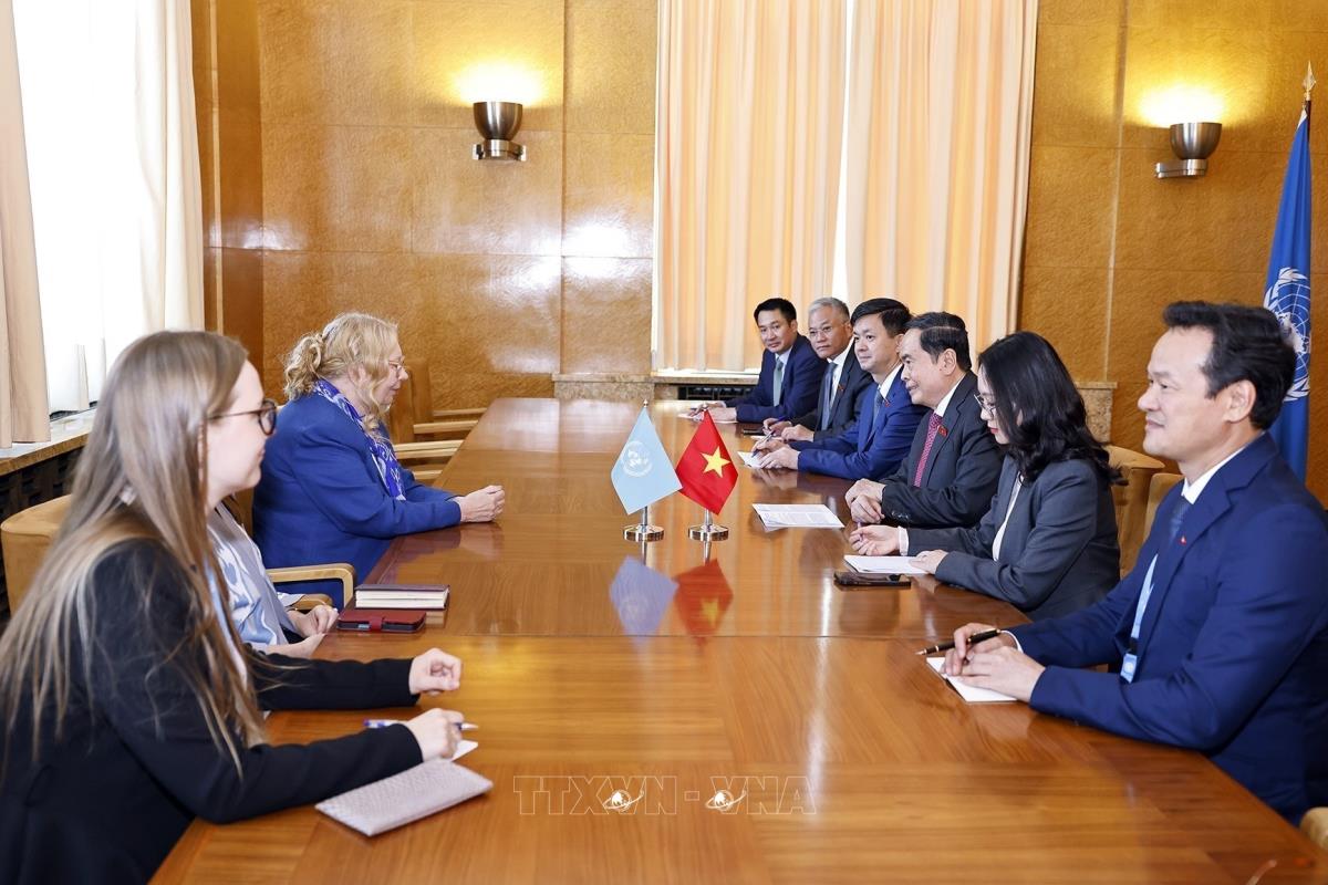 Trong khuôn khổ chương trình tham dự Hội nghị các Chủ tịch Quốc hội thế giới lần thứ 6 và tiến hành các hoạt động song phương tại Thụy Sĩ, chiều 29/7/2025, giờ địa phương (tối cùng ngày, giờ Hà Nội), tại Trụ sở Văn phòng Liên hợp quốc ở thành phố Geneva, Chủ tịch Quốc hội Trần Thanh Mẫn gặp bà Tatiana Valovaya, Tổng Giám đốc Văn phòng Liên hợp quốc tại Geneva (UNOG).
