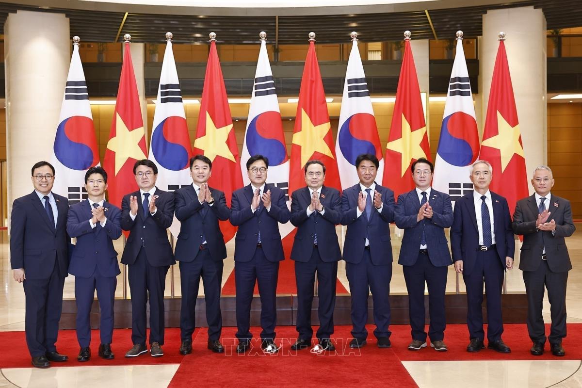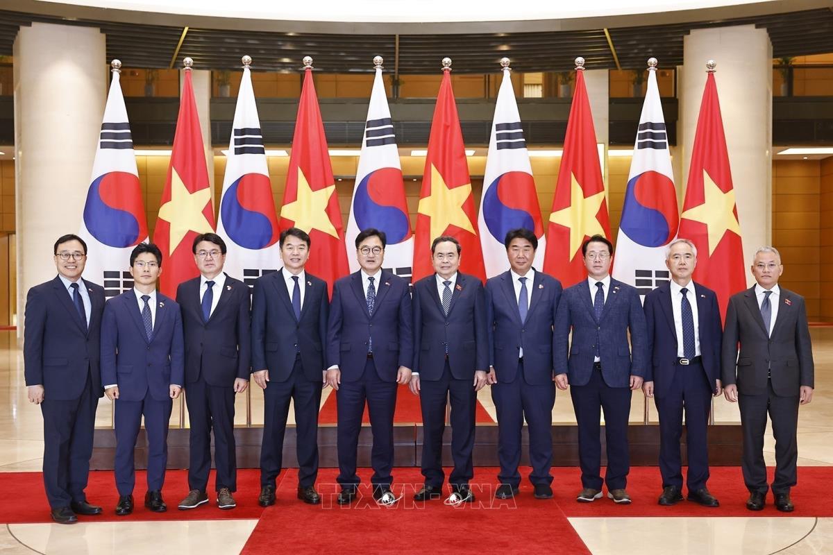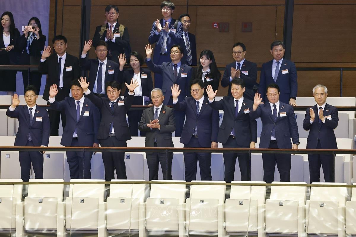 Chủ tịch Quốc hội Trần Thanh Mẫn và Chủ tịch Quốc hội Hàn Quốc Woo Won Shik với đại biểu (20/11/2025). Ảnh: Doãn Tấn - TTXVN