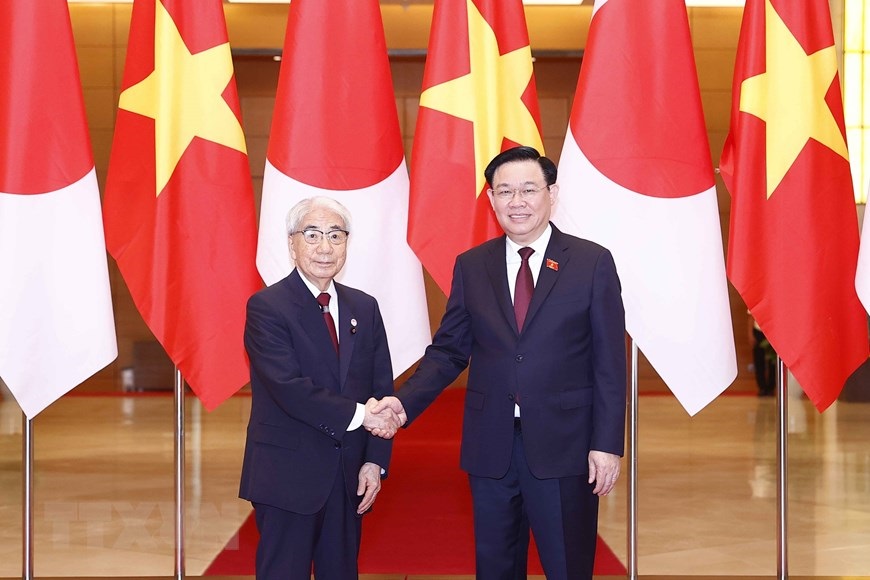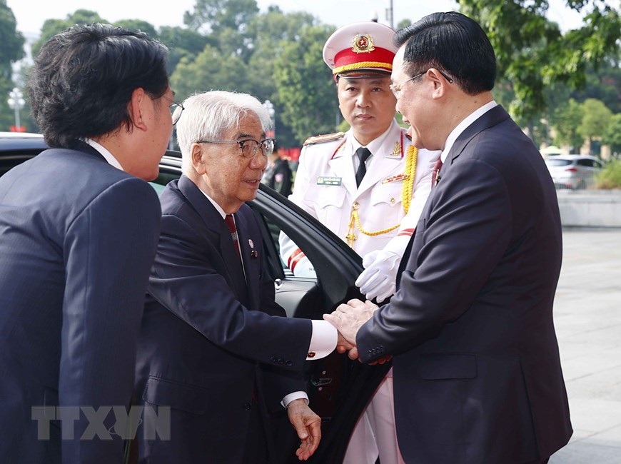 Chủ tịch Quốc hội Vương Đình Huệ đón Chủ tịch Thượng viện Nhật Bản Otsuji Hidehisa. (Ảnh: Doãn Tấn/TTXVN)