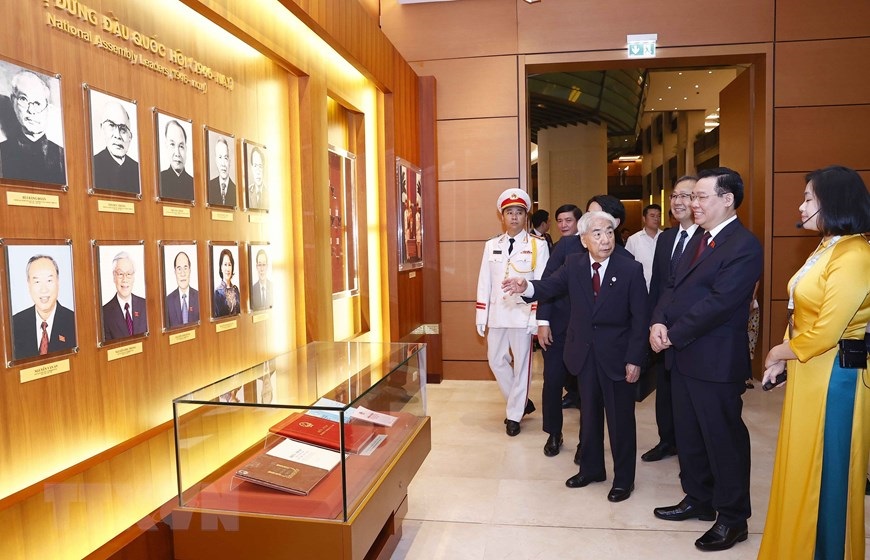 Chủ tịch Thượng viện Nhật Bản Otsuji Hidehisa thăm Phòng Truyền thống Nhà Quốc hội. (Ảnh: Doãn Tấn/TTXVN)