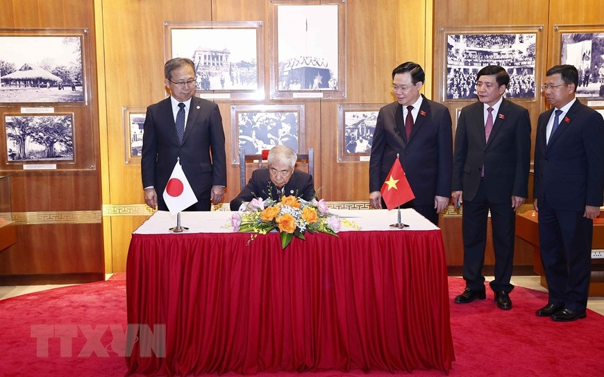 Chủ tịch Thượng viện Nhật Bản Otsuji Hidehisa thăm Phòng Truyền thống Nhà Quốc hội và ký Sổ Lưu niệm. (Ảnh: Doãn Tấn/TTXVN)
