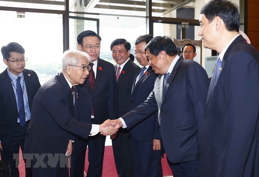 Chủ tịch Quốc hội Vương Đình Huệ và Chủ tịch Thượng viện Nhật Bản Otsuji Hidehisa chụp ảnh chung. (Ảnh: Doãn Tấn/TTXVN)