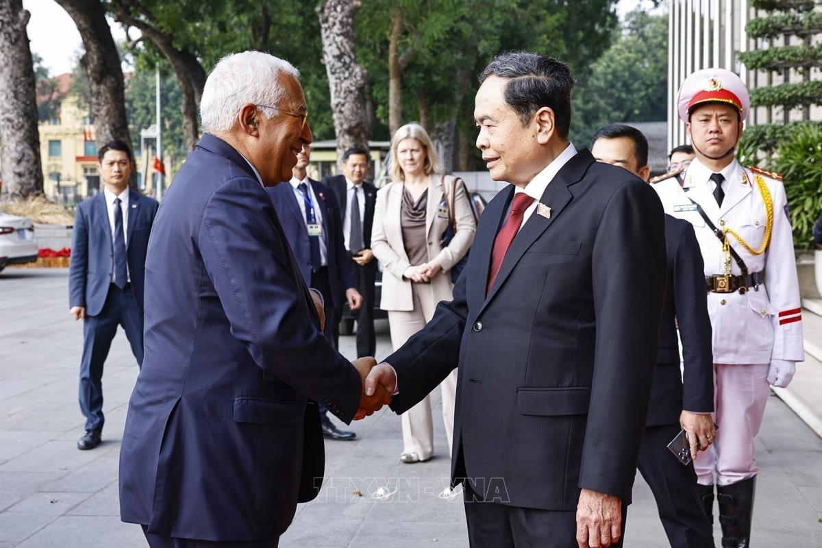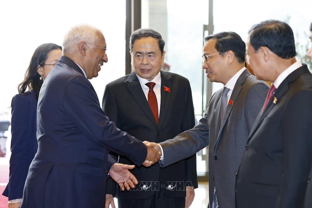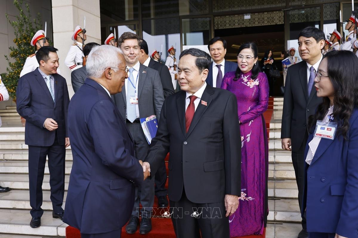 Chủ tịch Quốc hội Trần Thanh Mẫn và đoàn đại biểu Việt Nam đón Chủ tịch Hội đồng châu Âu António Costa. Ảnh: Doãn Tấn - TTXVN
