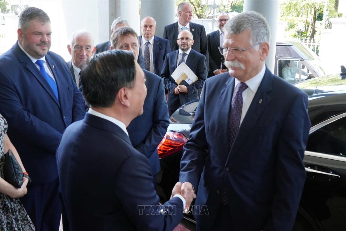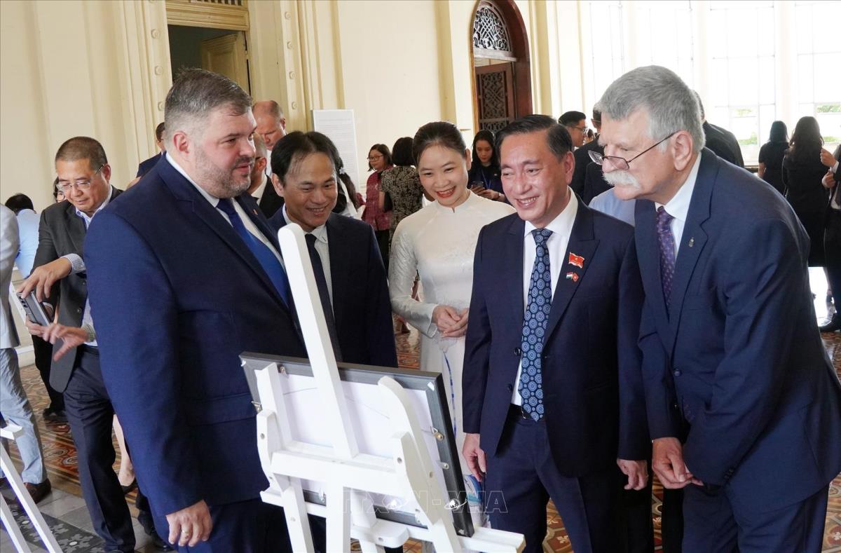 Phó Chủ tịch thường trực HĐND TP.Hồ Chí Minh Phạm Thành Kiên đón Chủ tịch Quốc hội Hungary Kover Laszlo dự khai mạc triển lãm ảnh (19/10/2025). Ảnh: Trung Tuyến - TTXVN