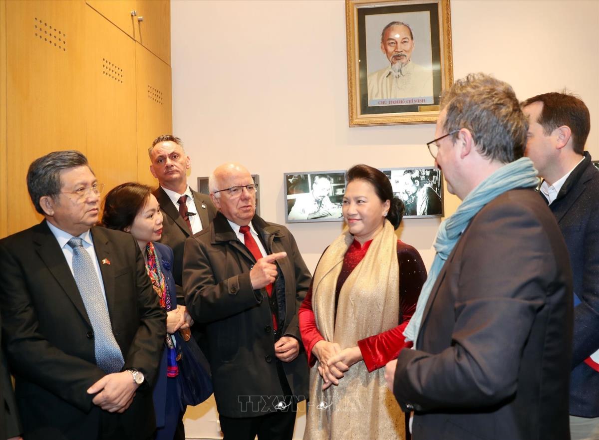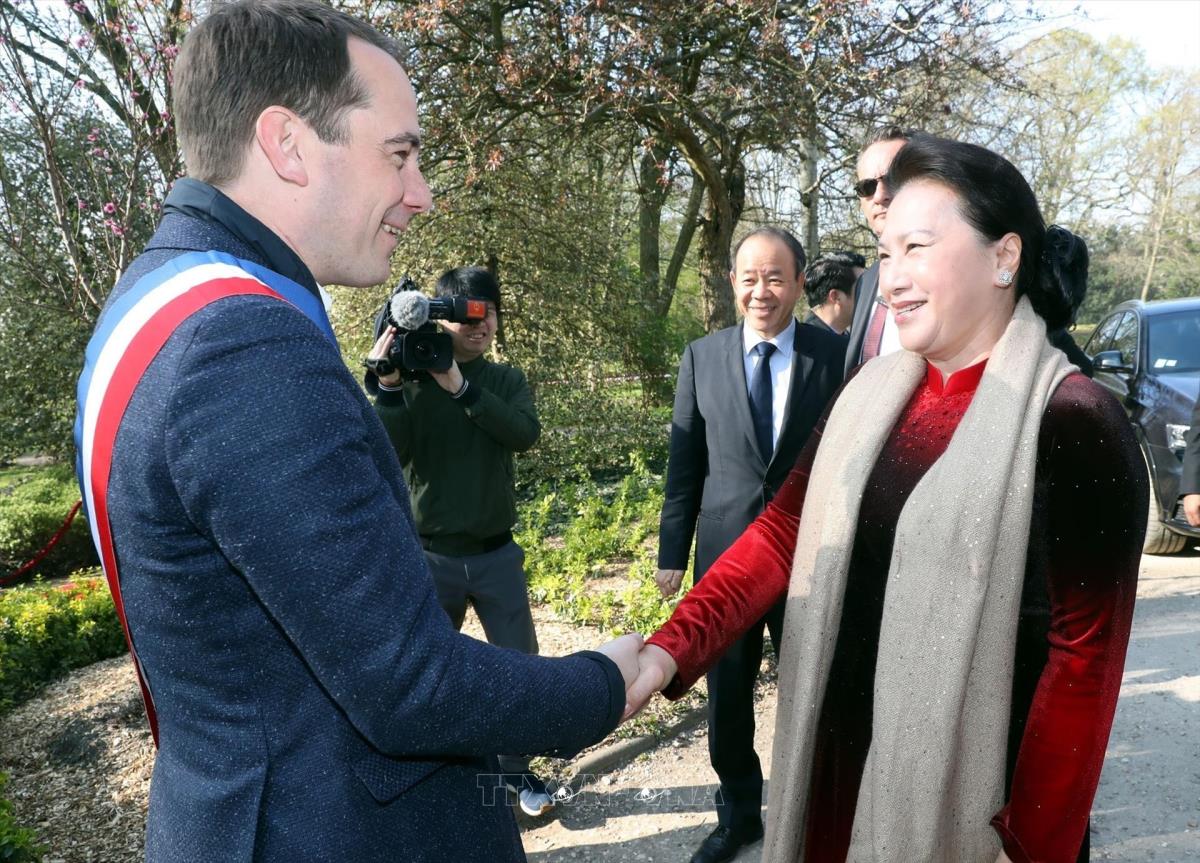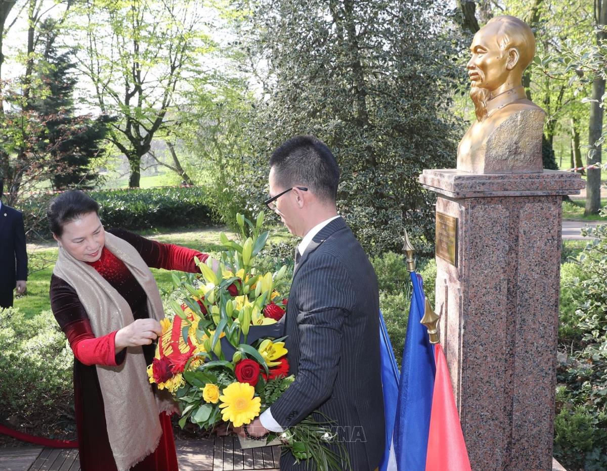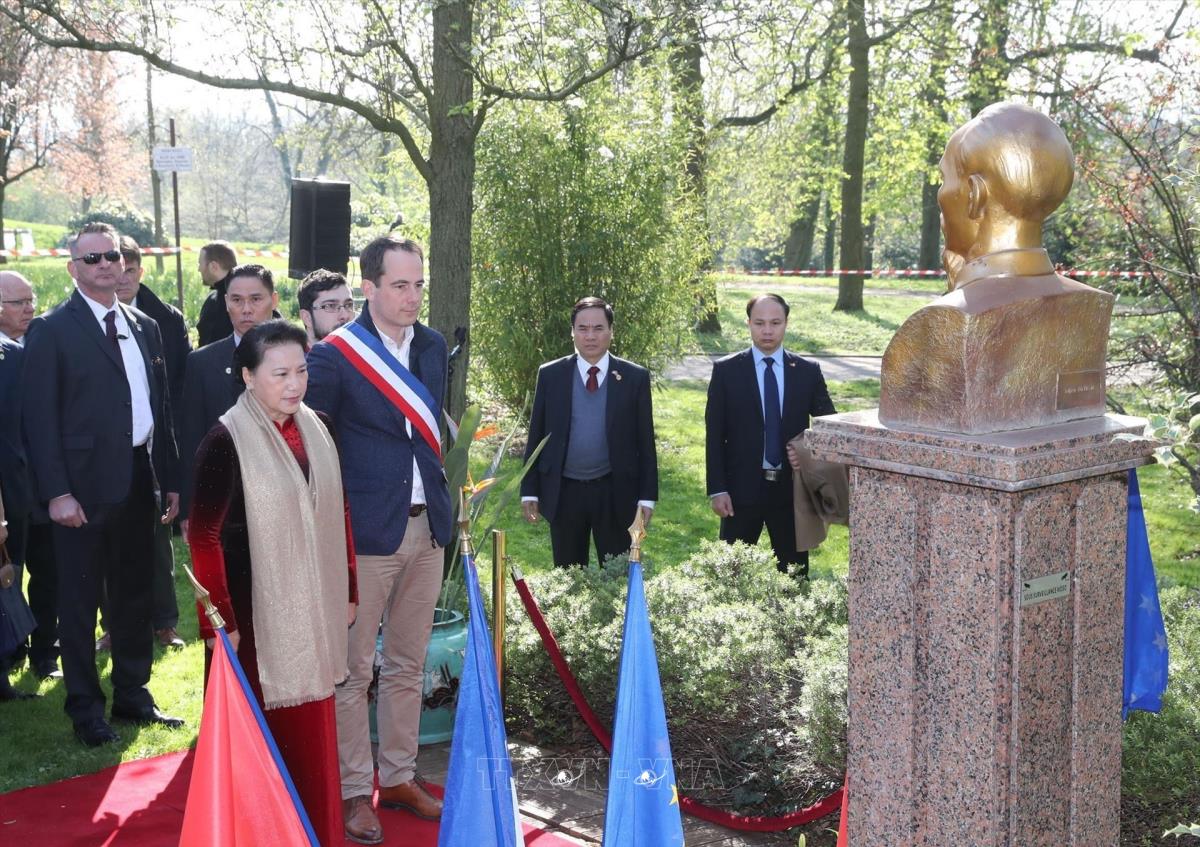 Chủ tịch Quốc hội Nguyễn Thị Kim Ngân với đại diện lãnh đạo thành phố Paris đến đặt hoa tại Tượng đài Chủ tịch Hồ Chí Minh (31/3/2019). Ảnh: Trọng Đức - TTXVN