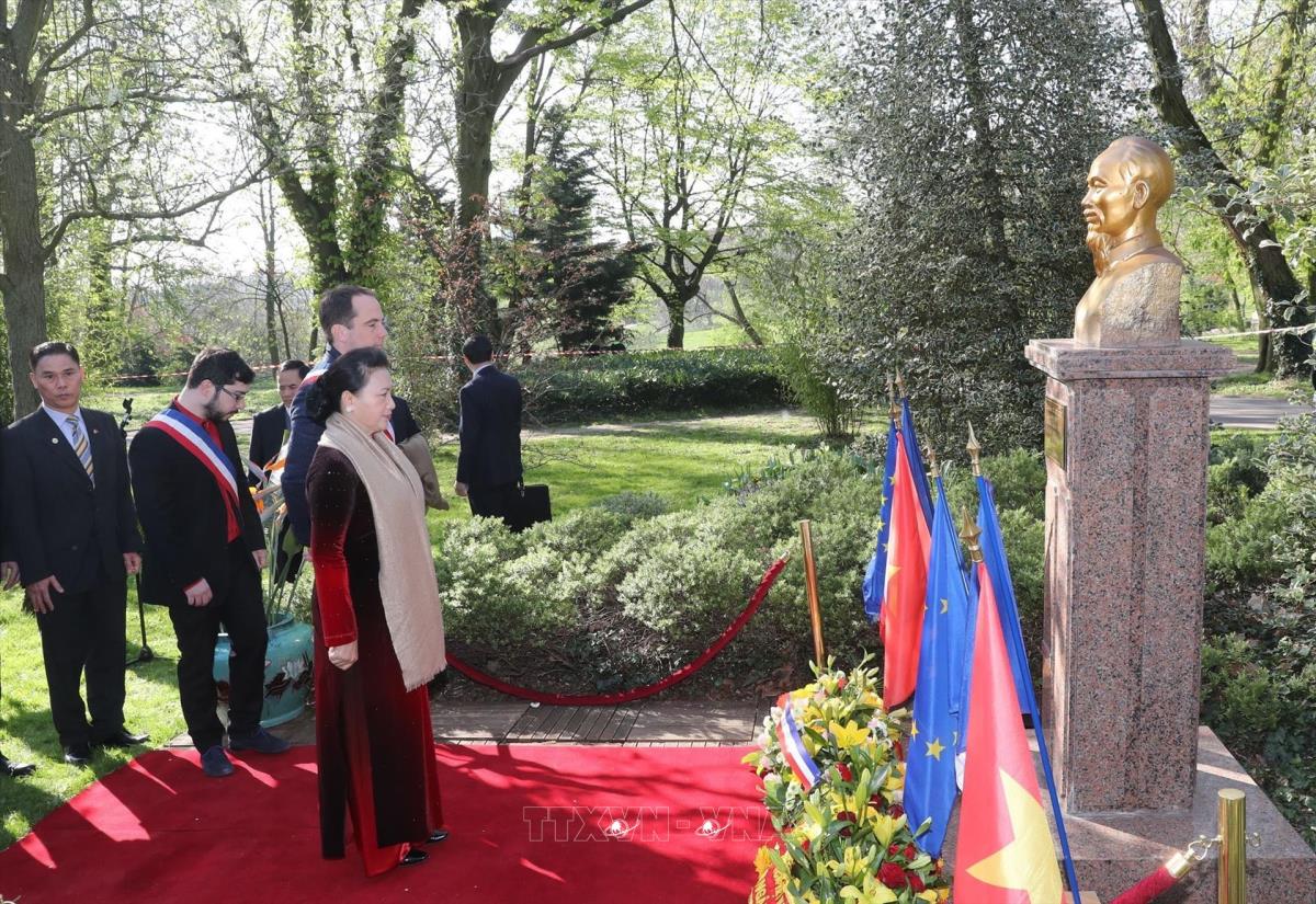 [Photo] Chủ tịch Quốc hội Nguyễn Thị Kim Ngân đặt hoa tại Tượng đài Chủ tịch Hồ Chí Minh ở thành phố Montreuil, Pháp