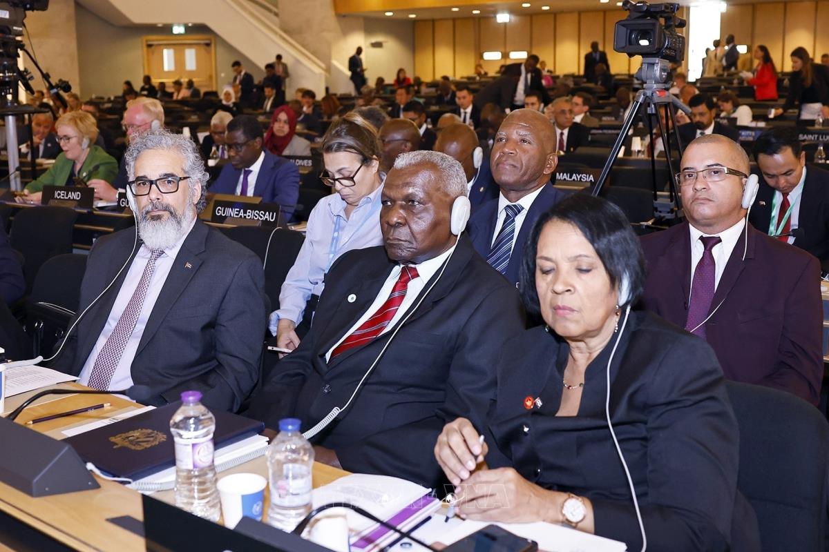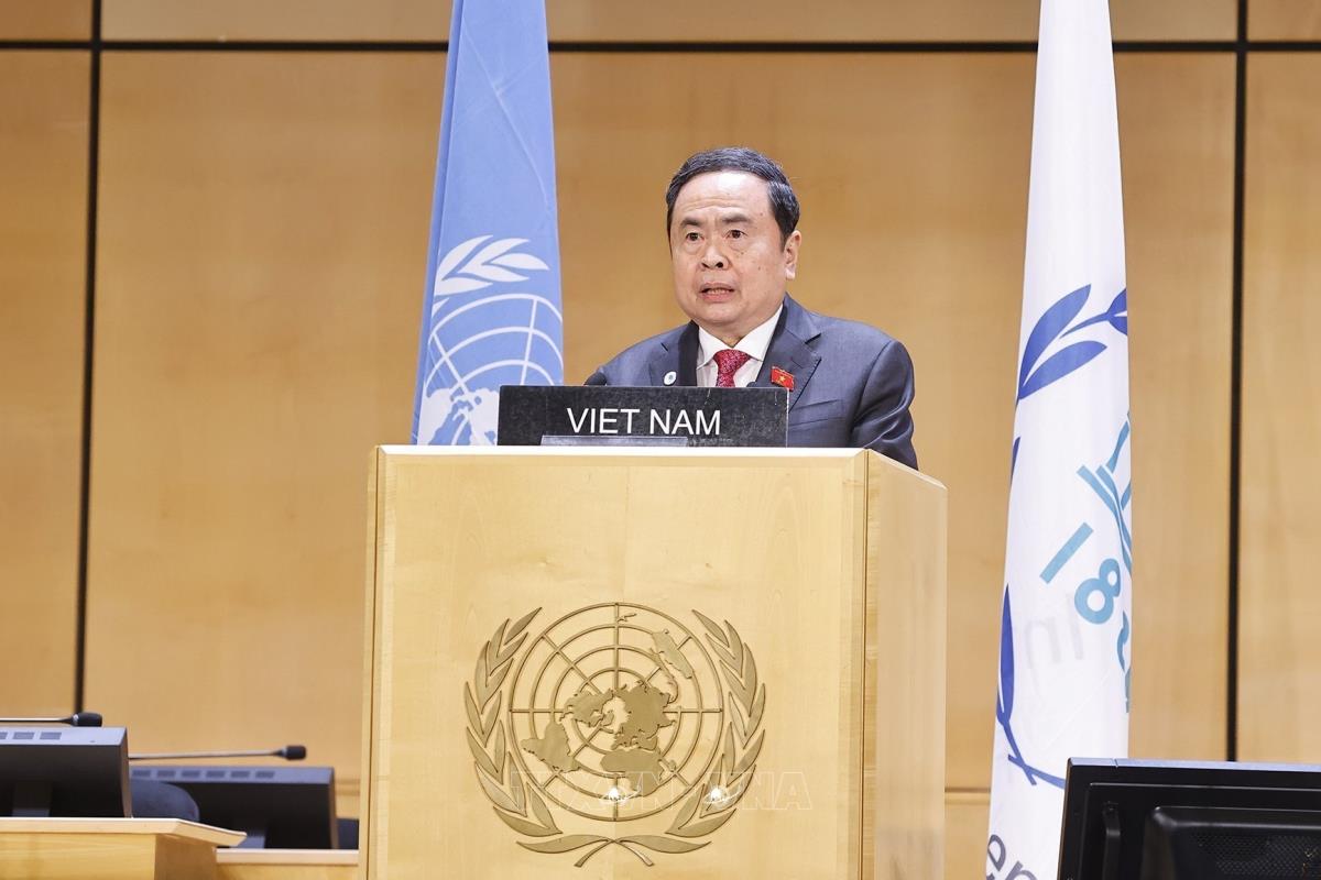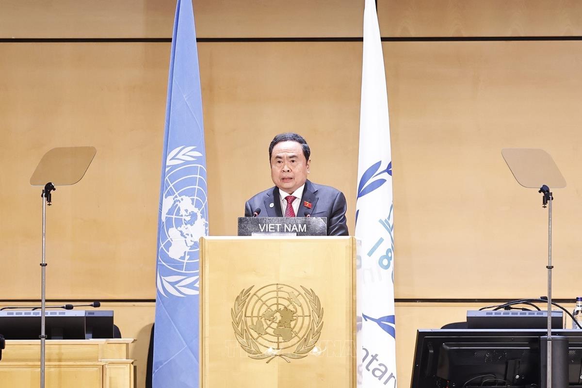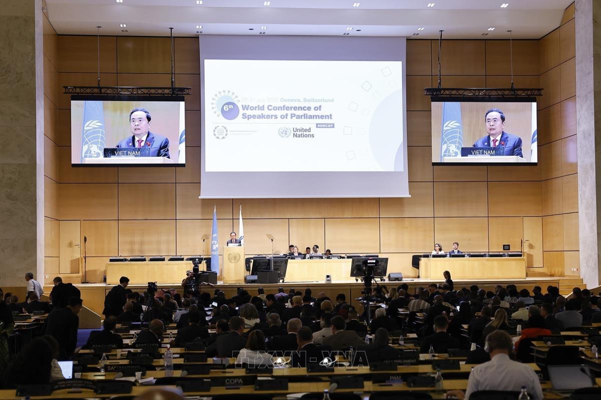 Tiếp tục chương trình tham dự Hội nghị các Chủ tịch Quốc hội Thế giới lần thứ 6 ở Geneva (Thụy Sĩ), chiều 29/7/2025, giờ địa phương (tối cùng ngày, giờ Hà Nội), Chủ tịch Quốc hội Trần Thanh Mẫn dự và phát biểu tại Phiên thảo luận chung với chủ đề “Một thế giới đang hỗn loạn: Hợp tác nghị viện và chủ nghĩa đa phương vì hòa bình, công bằng và thịnh vượng cho mọi người dân”.