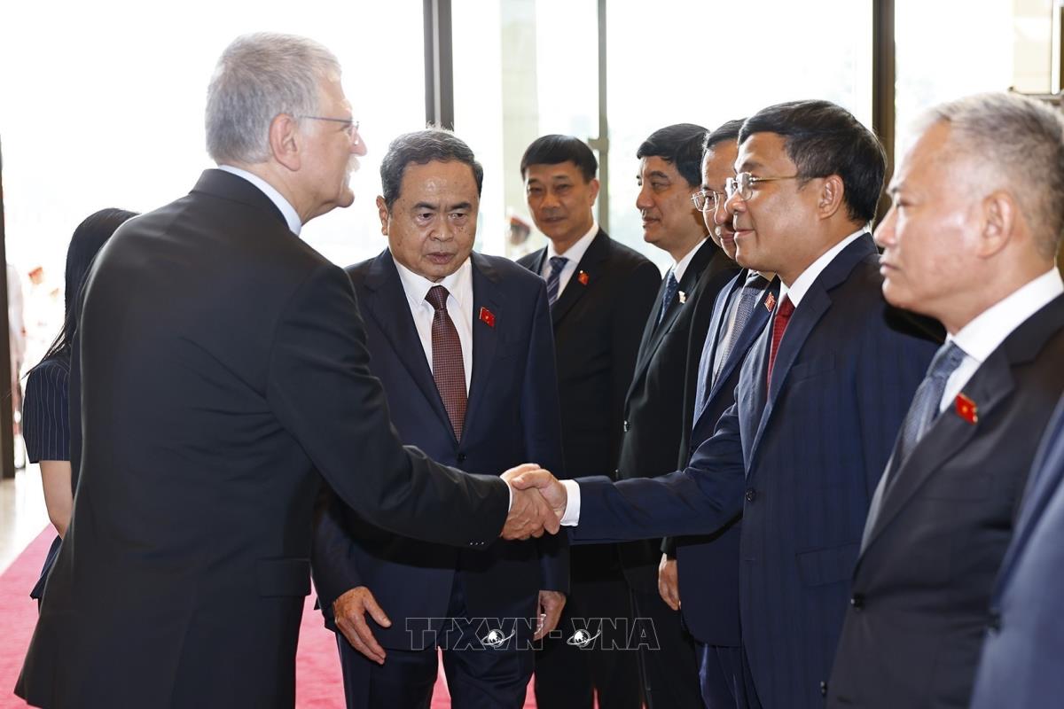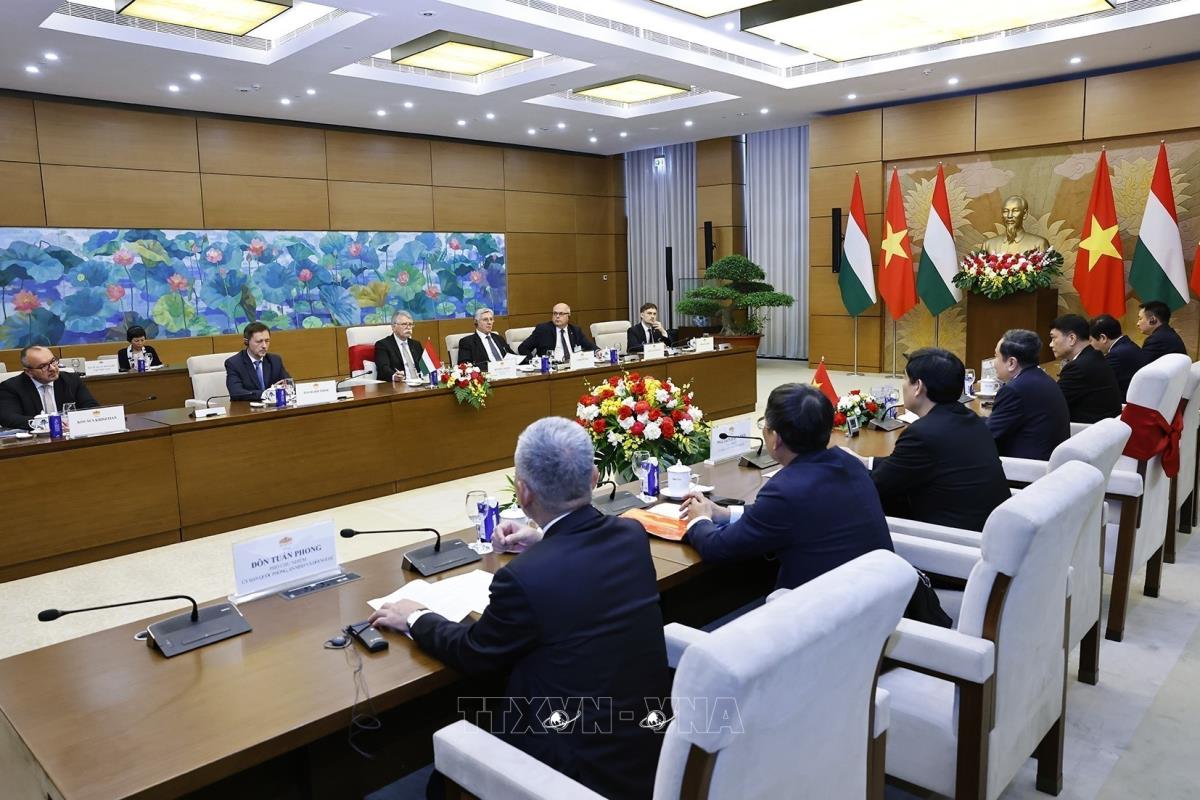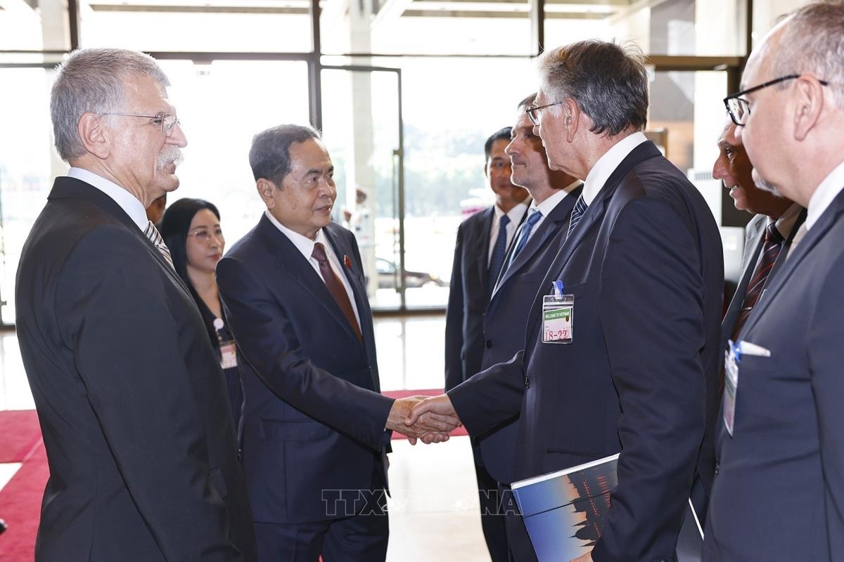 Chủ tịch Quốc hội Trần Thanh Mẫn giới thiệu Chủ tịch Quốc hội Hungary Kover Laszlo các thành viên đoàn Việt Nam (20/10/2025). Ảnh: Doãn Tấn - TTXVN