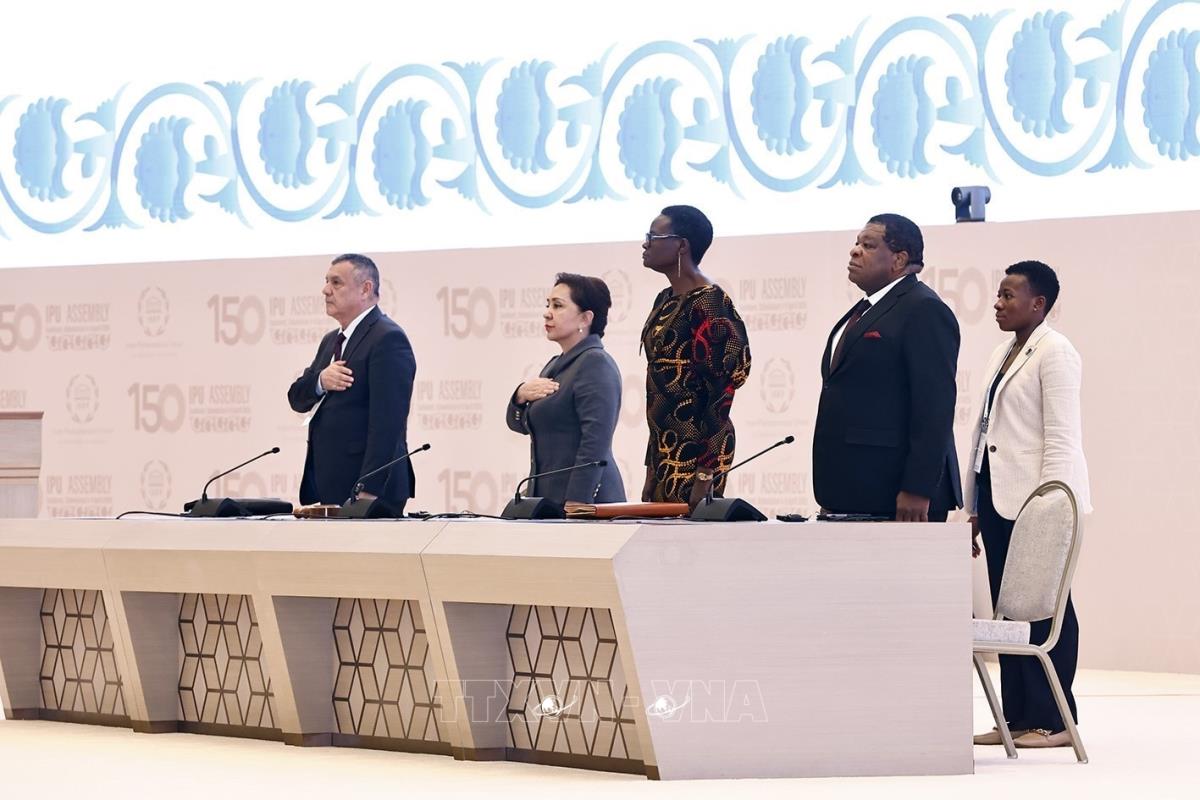 Các đại biểu thực hiện nghi thức nghe cử hành Quốc ca Uzbekistan và ca khúc IPU tại Lễ khai mạc IPU-150 (5/4/2025). Ảnh: Doãn Tấn – TTXVN