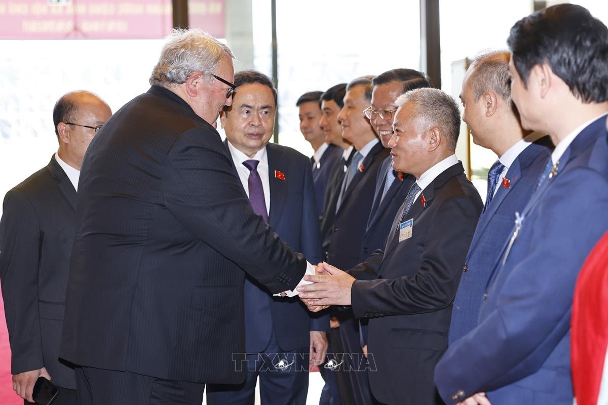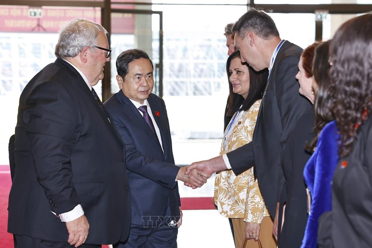 Chủ tịch Quốc hội Trần Thanh Mẫn giới thiệu đại biểu Việt Nam với Chủ tịch Quốc hội New Zealand Gerry Brownlee (28/8/2025). Ảnh: Doãn Tấn – TTXVN