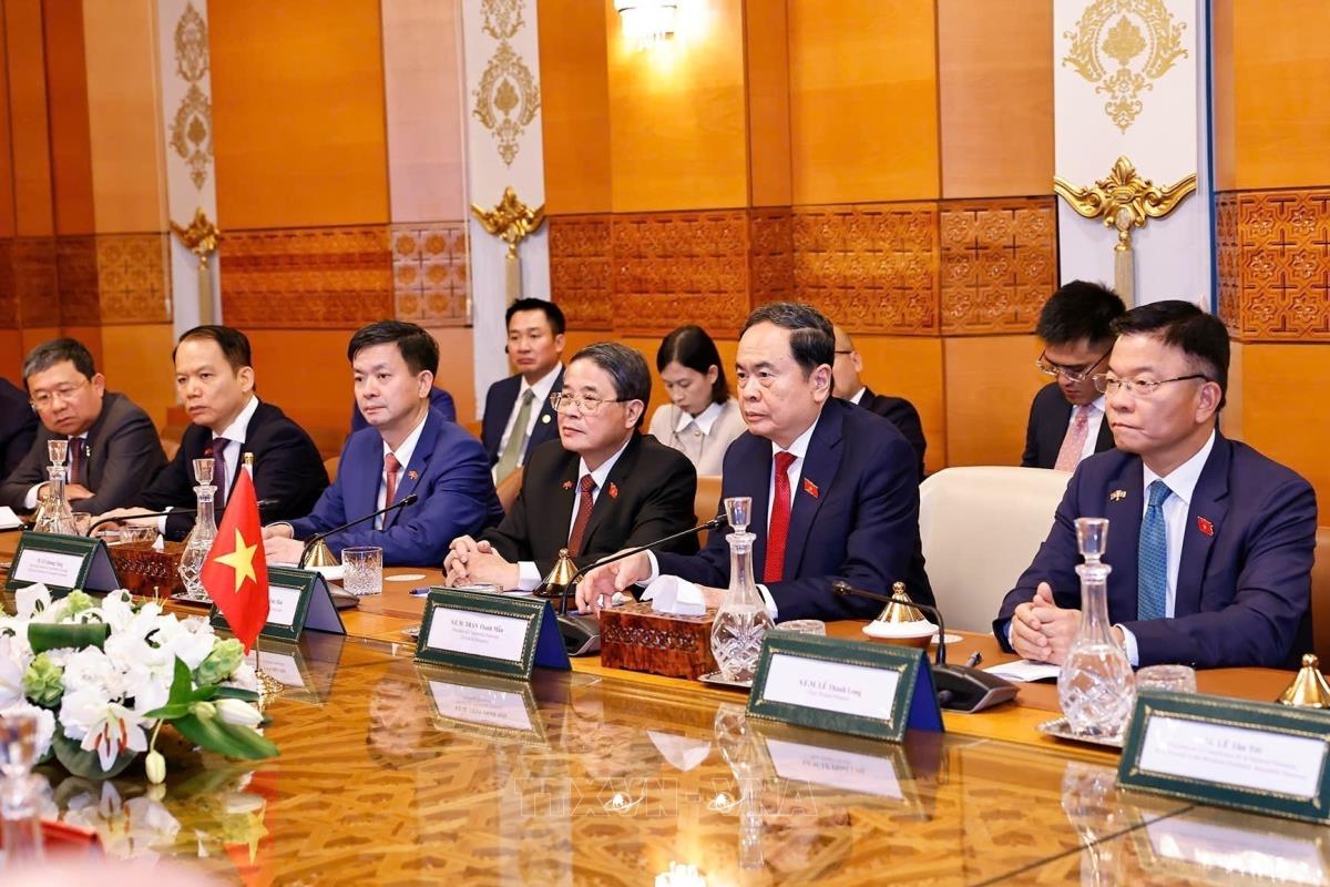 Chủ tịch Quốc hội Trần Thanh Mẫn hội kiến Chủ tịch Thượng viện Maroc Mohamed Ould Errachid (sáng 25/7/2025, giờ địa phương) . Ảnh: Doãn Tấn - TTXVN