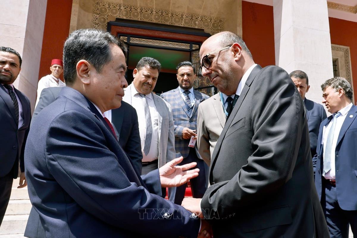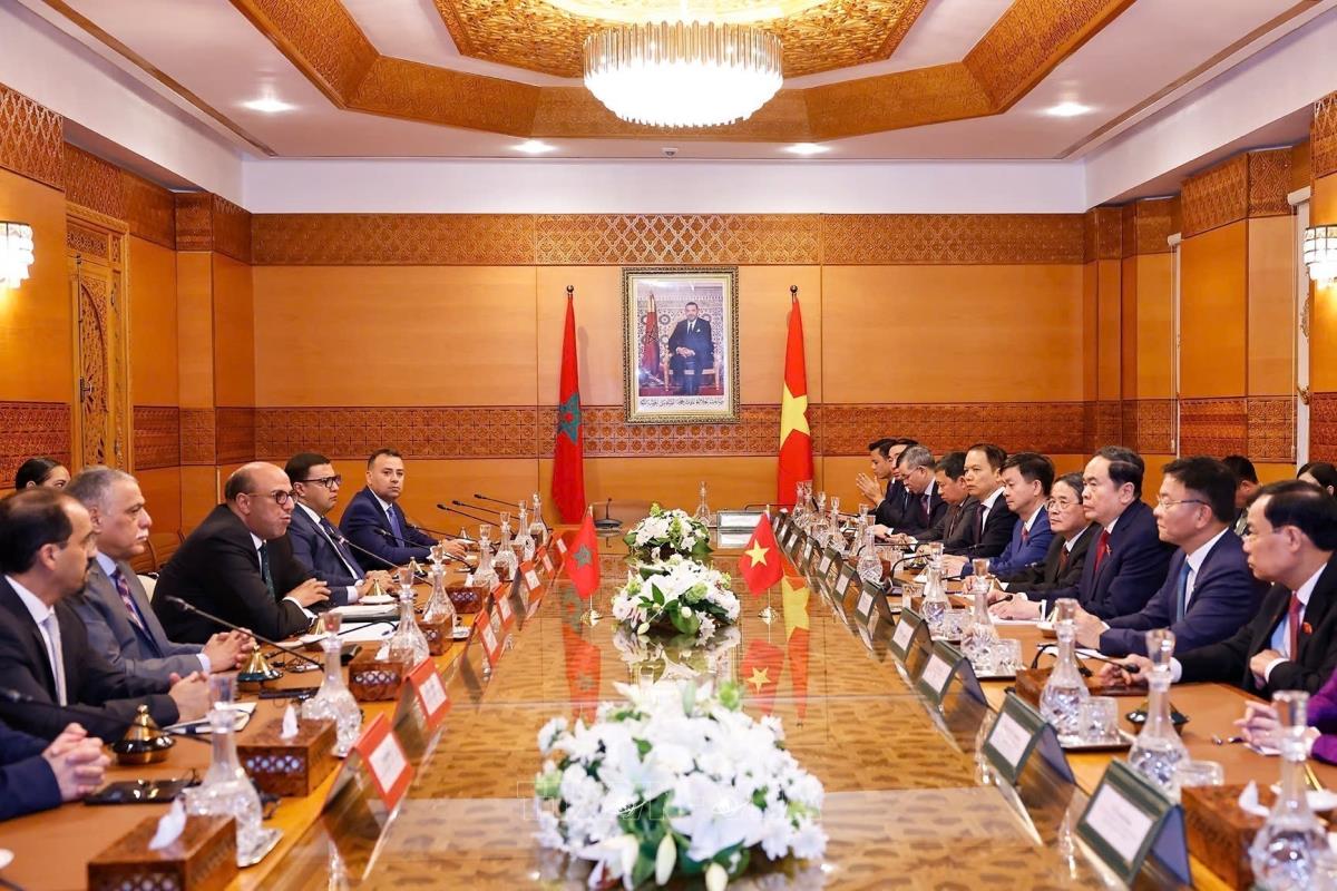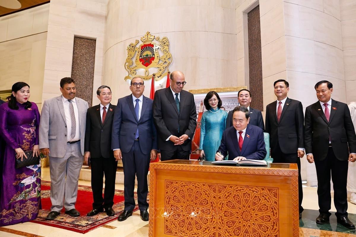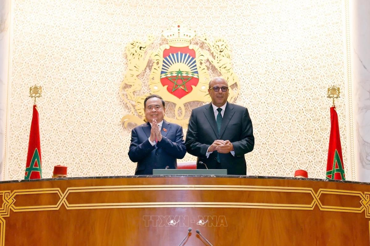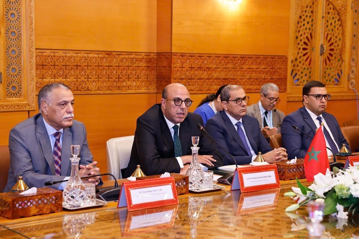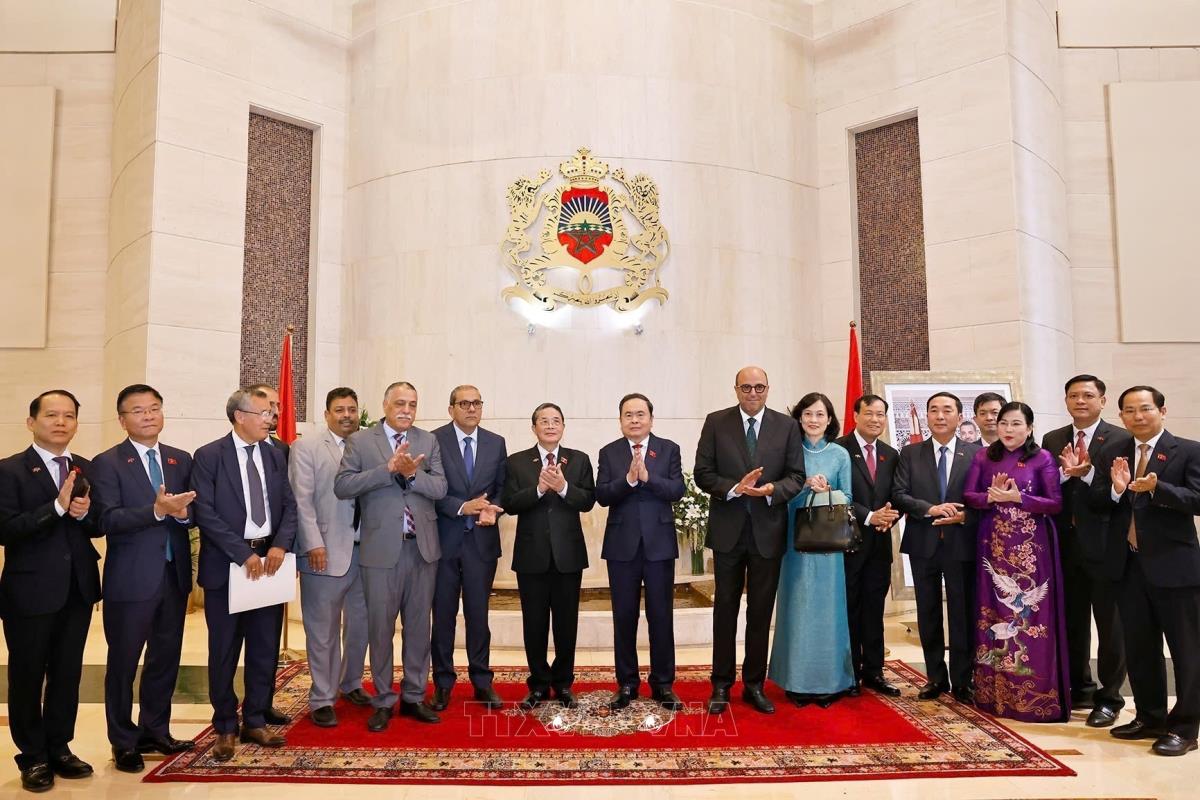 Chủ tịch Quốc hội Trần Thanh Mẫn và Chủ tịch Thượng viện Maroc Mohamed Ould Errachid cùng các đại biểu (sáng 25/7/2025, giờ địa phương). Ảnh: Doãn Tấn - TTXVN