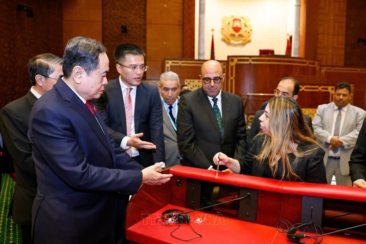Chủ tịch Quốc hội Trần Thanh Mẫn và Chủ tịch Thượng viện Maroc Mohamed Ould Errachid tham quan phòng họp Thượng viện (sáng 25/7/2025, giờ địa phương). Ảnh: Doãn Tấn - TTXVN
