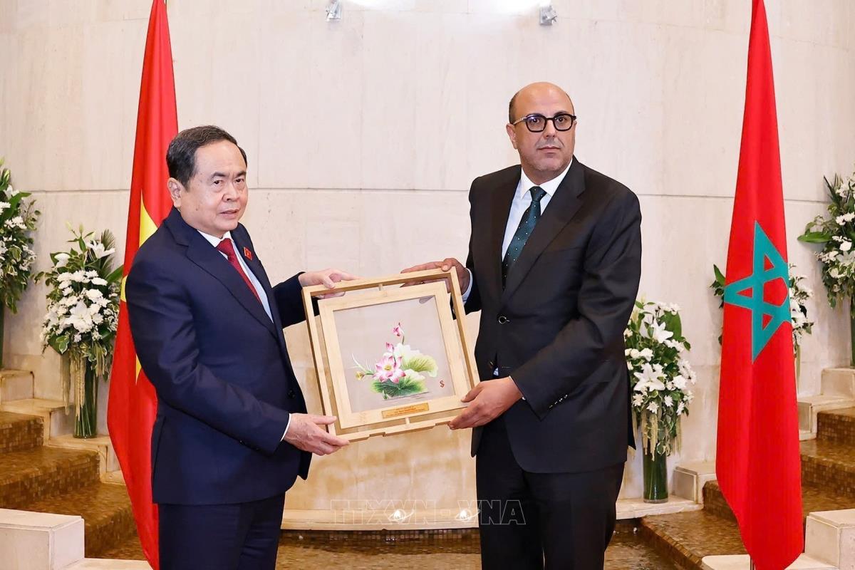 Chủ tịch Quốc hội Trần Thanh Mẫn tặng quà lưu niệm cho Chủ tịch Thượng viện Maroc Mohamed Ould Errachid (sáng 25/7/2025, giờ địa phương). Ảnh: Doãn Tấn - TTXVN
