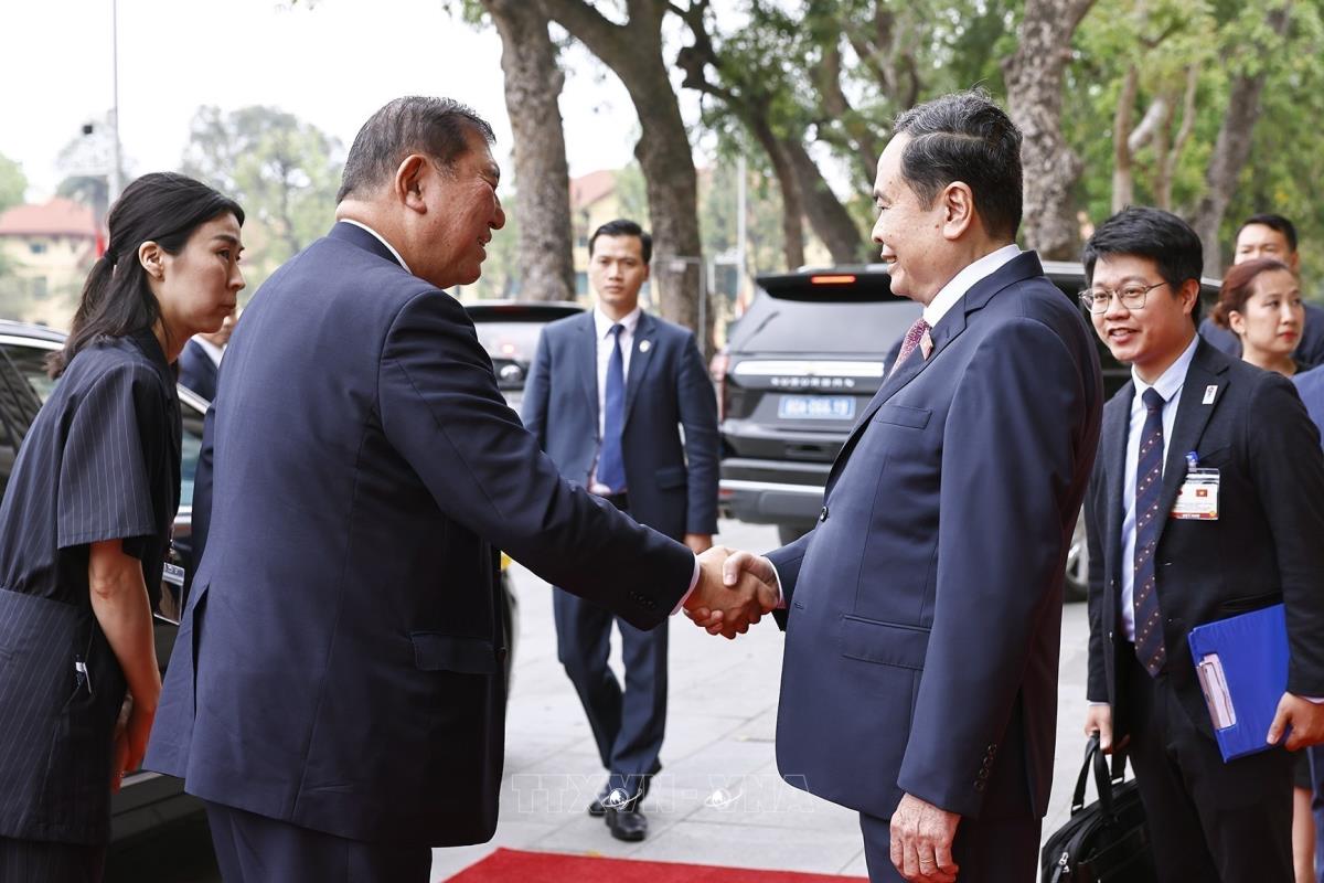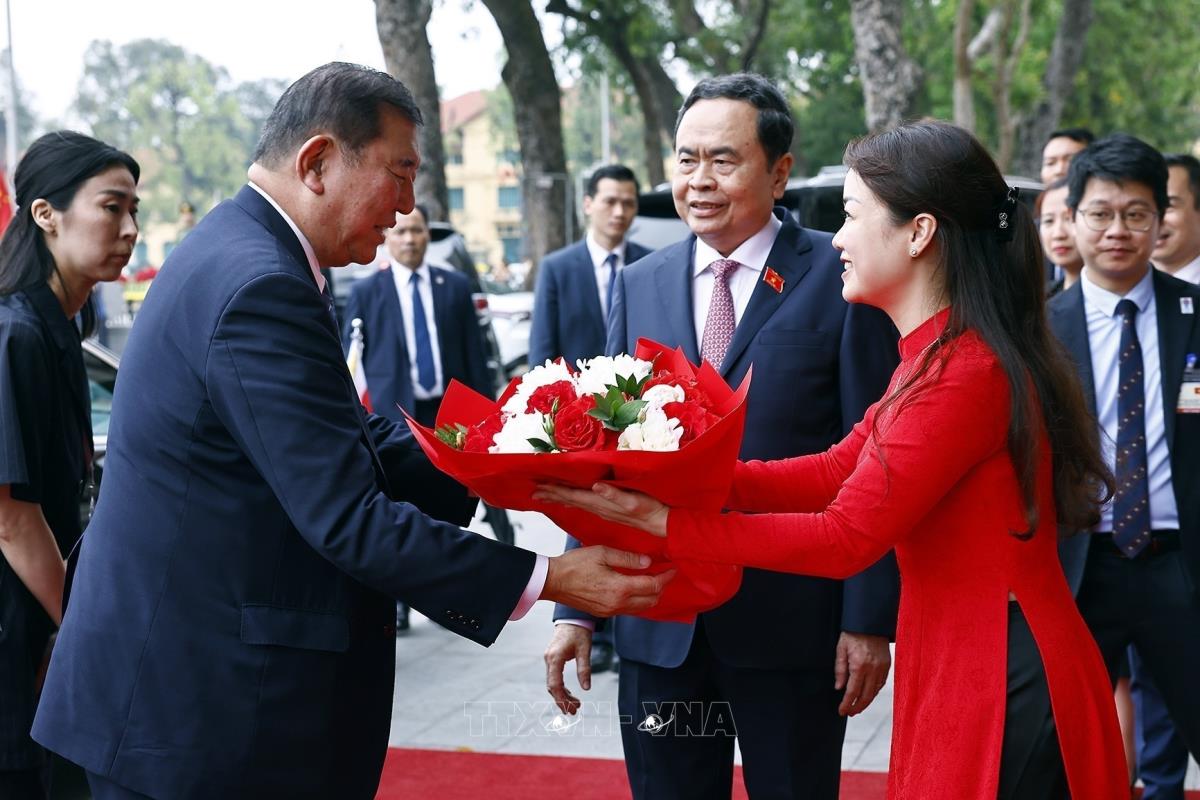 Chủ tịch Quốc hội Trần Thanh Mẫn đón Thủ tướng Nhật Bản Ishiba Shigeru (28/4/2025). Ảnh: Doãn Tấn - TTXVN