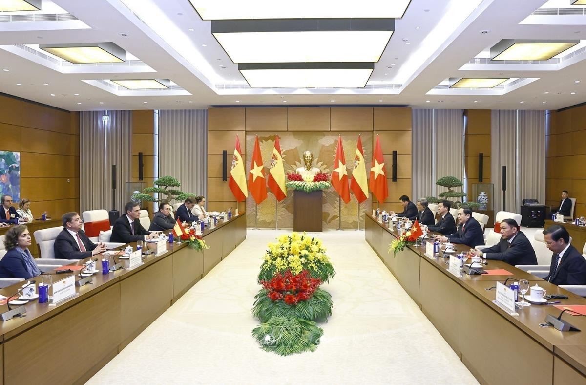 Tại hội kiến, Chủ tịch Quốc hội Trần Thanh Mẫn hoan nghênh Thủ tướng Pedro Sánchez cùng Đoàn đại biểu cấp cao Tây Ban Nha thăm chính thức Việt Nam; nhấn mạnh ý nghĩa quan trọng của chuyến thăm Việt Nam đầu tiên của người đứng đầu Chính phủ Tây Ban Nha kể từ khi hai nước thiết lập quan hệ ngoại giao; tin tưởng, chuyến thăm sẽ là động lực quan trọng, mở ra chương mới cho quan hệ “Đối tác chiến lược hướng tới tương lai” Việt Nam - Tây Ban Nha.
