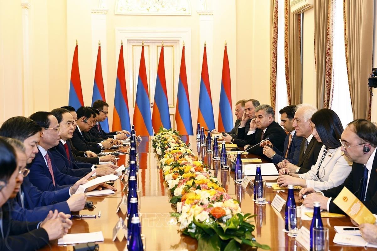 Trong bầu không khí chân thành và cởi mở, hai nhà lãnh đạo vui mừng trước những bước phát triển tích cực của quan hệ Việt Nam – Armenia trên nhiều lĩnh vực; ghi nhận việc duy trì trao đổi đoàn các cấp, đặc biệt là cấp cao trên tất cả các kênh được triển khai tích cực, hiệu quả nhằm tiếp tục củng cố quan hệ và sự tin cậy lẫn nhau, đáp ứng lợi ích của cả hai nước. Đồng thời, đánh giá cao đà tăng trưởng tích cực của hợp tác kinh tế - thương mại giữa hai nước, nhất là trong những năm gần đây sau khi Hiệp định Thương mại tự do (FTA) giữa Việt Nam và Liên minh Kinh tế Á - Âu (EAEU) có hiệu lực vào năm 2016; trong đó kim ngạch thương mại song phương năm 2023 đạt 342 triệu USD; năm 2024 đạt gần 500 triệu USD, cũng như đánh giá cao việc hai nước vừa tổ chức Tọa đàm doanh nghiệp đã góp phần kết nối doanh nghiệp nhằm thúc đẩy hợp tác đầu tư giữa hai nước.