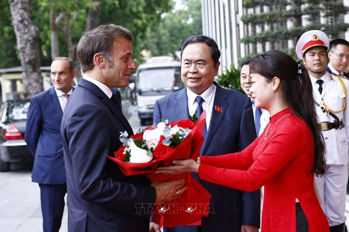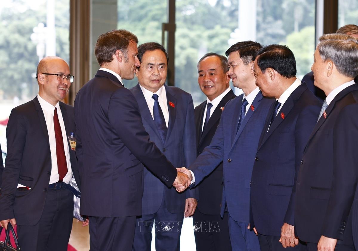 Chủ tịch Quốc hội Trần Thanh Mẫn và đại biểu Việt Nam đón Tổng thống Cộng hoà Pháp Emmanuel Macron (26/5/2025). Ảnh: Doãn Tấn – TTXVN
