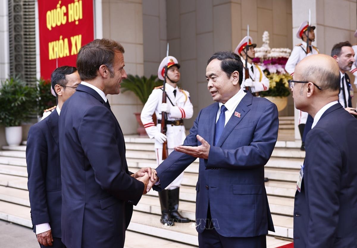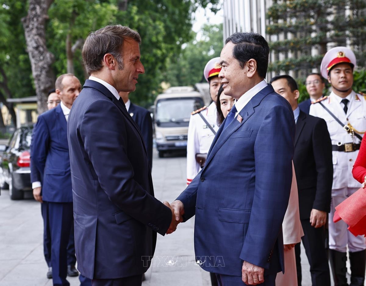 Chủ tịch Quốc hội Trần Thanh Mẫn đón Tổng thống Cộng hoà Pháp Emmanuel Macron (26/5/2025). Ảnh: Doãn Tấn – TTXVN