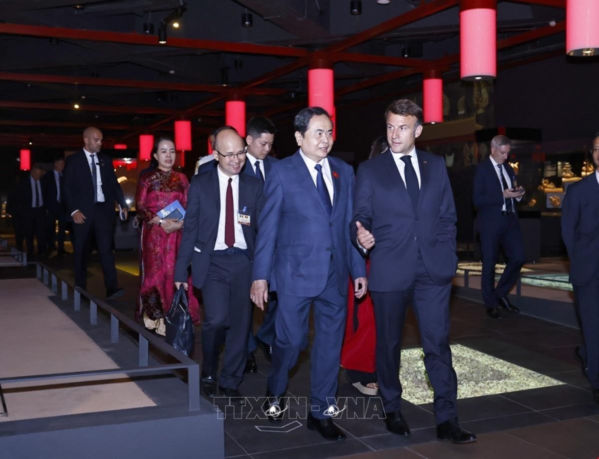 Chủ tịch Quốc hội Trần Thanh Mẫn và Tổng thống Pháp Emmanuel Macron thăm Khu trưng bày khảo cổ dưới lòng tòa nhà Quốc hội (26/5/2025). Ảnh: Doãn Tấn - TTXVN