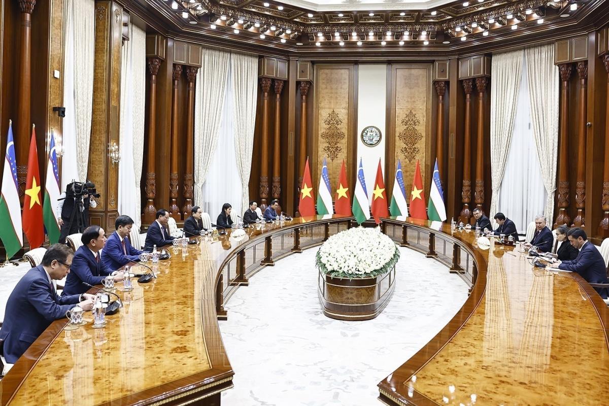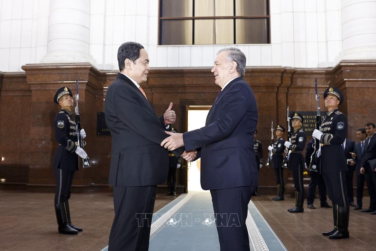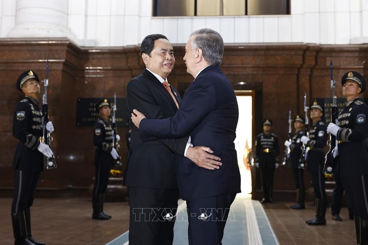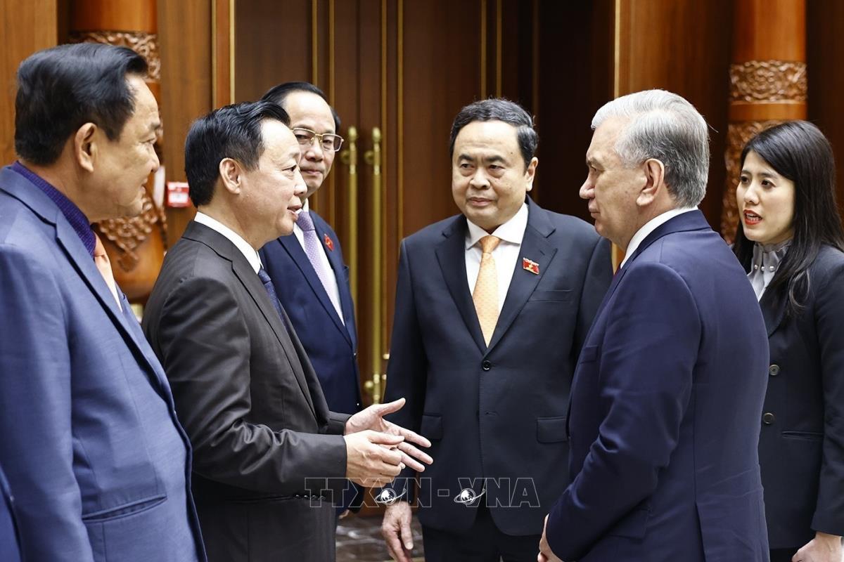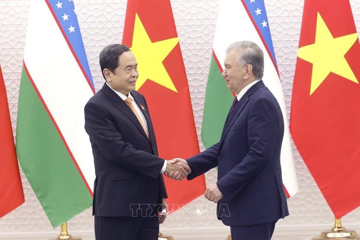 Chủ tịch Quốc hội Trần Thanh Mẫn hội kiến Tổng thống Uzbekistan Shavkat Mirziyoyev (7/4/2025). Ảnh: Doãn Tấn - TTXVN