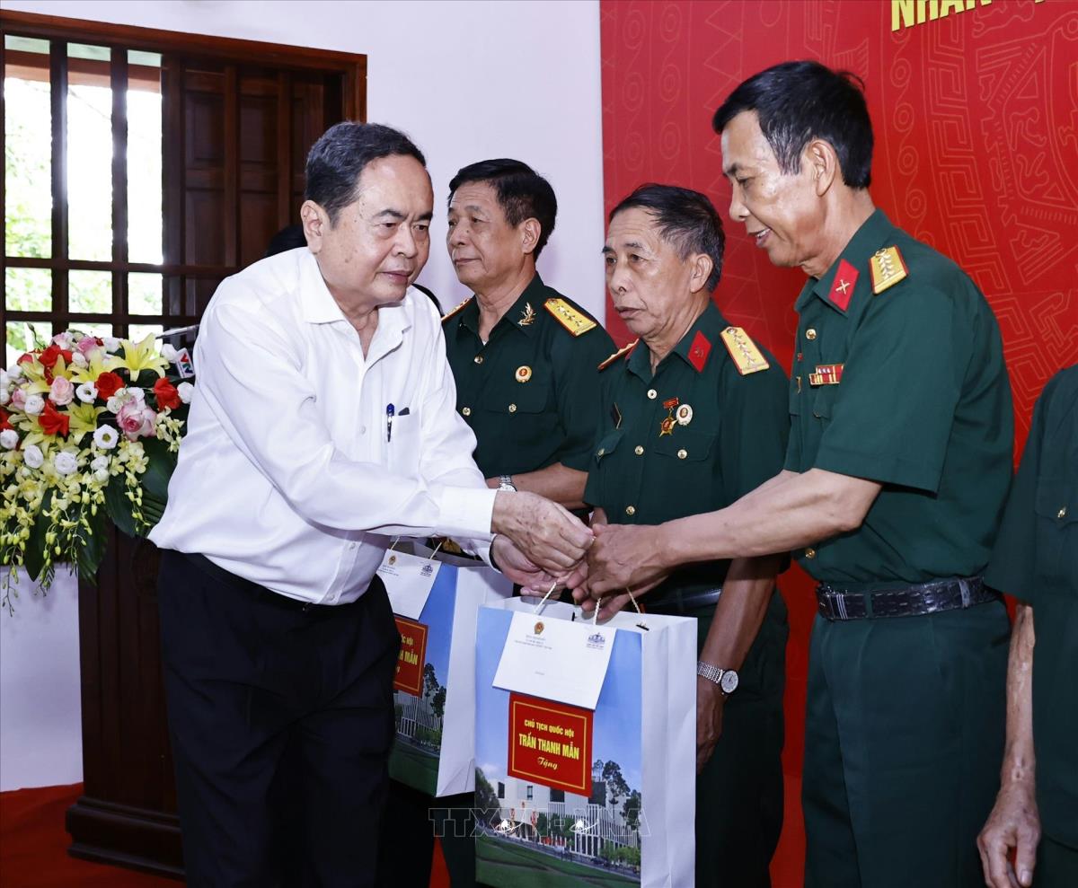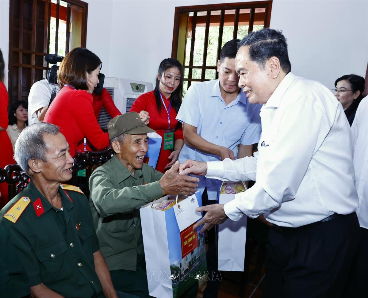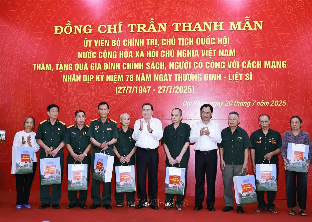 Chủ tịch Quốc hội Trần Thanh Mẫn tặng quà gia đình chính sách, người có công với cách mạng tại Khu di tích lịch sử Quốc gia 27/7, tỉnh Thái Nguyên (20/7/2025). Ảnh: Doãn Tấn - TTXVN