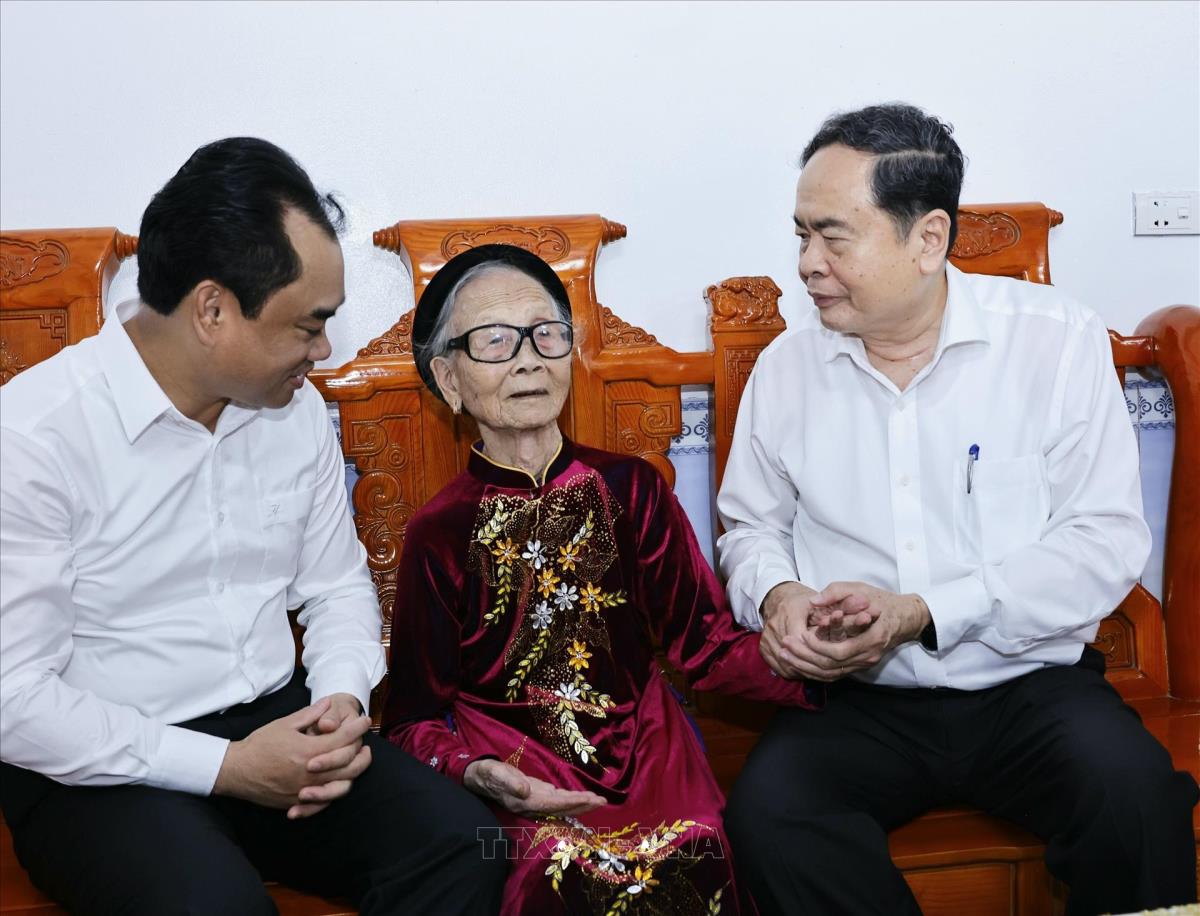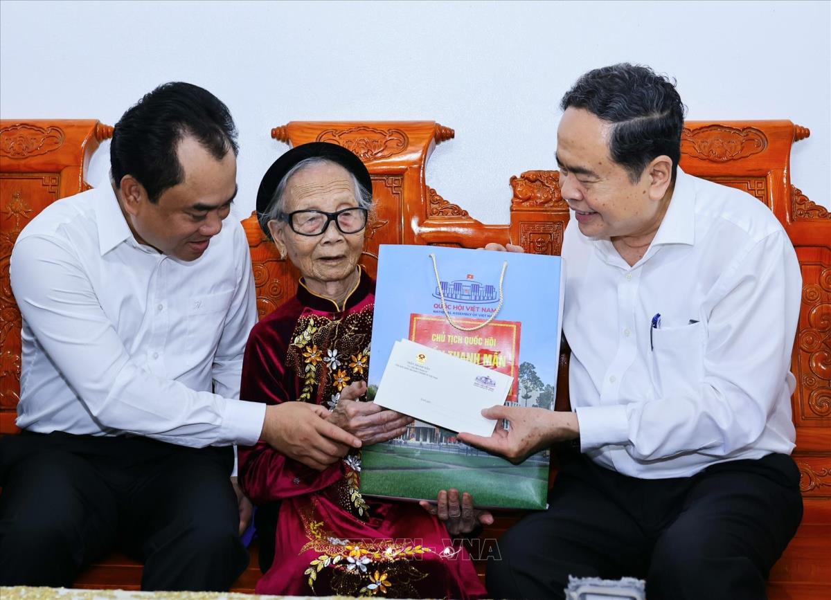 Chủ tịch Quốc hội Trần Thanh Mẫn thăm và tặng quà Mẹ Tạ Thị Trần (20/7/2025). Ảnh: Doãn Tấn - TTXVN