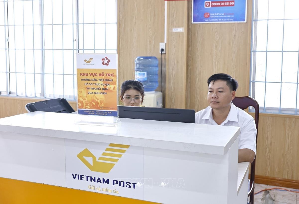 Khu vực hỗ trợ hướng dẫn, tiếp nhận Hồ sơ trực tuyến và trả kết quả qua bưu điện tại Trung tâm phục vụ hành chính công xã Vị Thuỷ (1/7/2025). Ảnh: Doãn Tấn - TTXVN