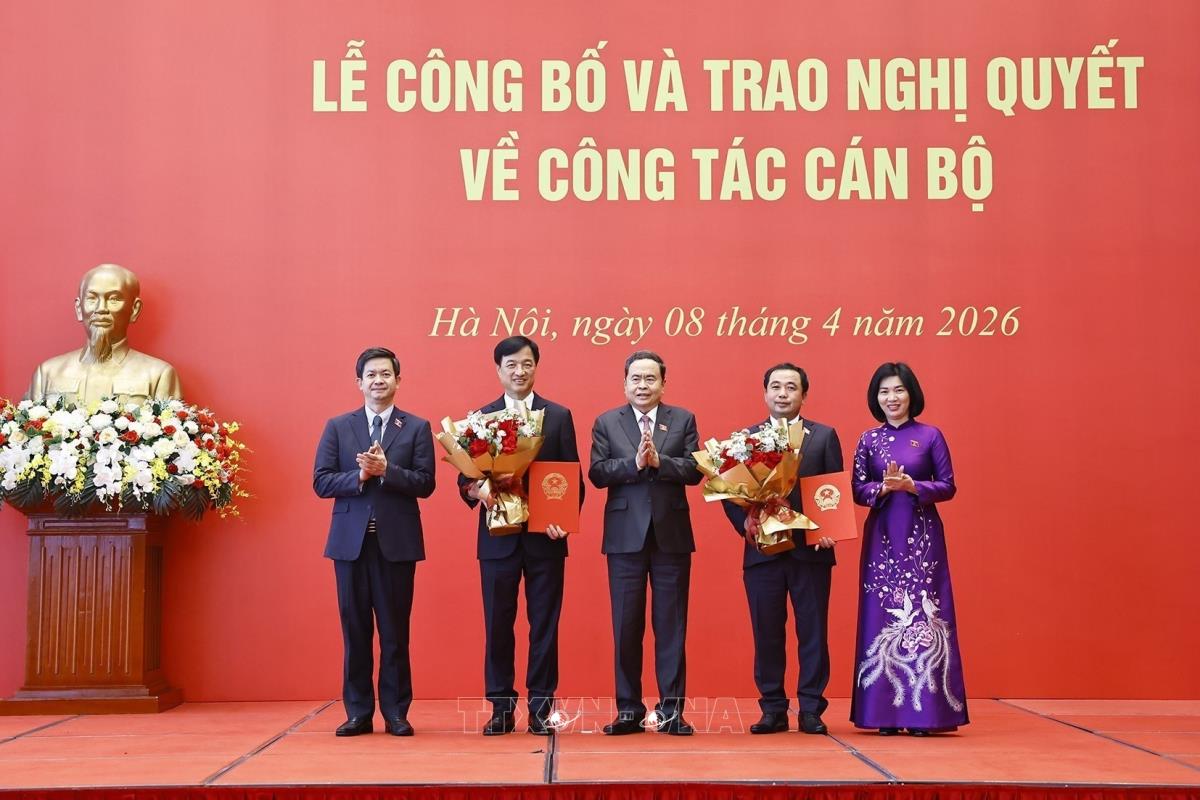 Hà Nội (TTXVN 8/4/2026) Chiều 8/4, tại Nhà Quốc hội, Ủy viên Bộ Chính trị, Bí thư Đảng ủy Quốc hội, Chủ tịch Quốc hội Trần Thanh Mẫn đã trao Nghị quyết chuyển Đoàn đại biểu Quốc hội và Nghị quyết phê chuẩn Trưởng đoàn đại biểu Quốc hội của Ủy ban Thường vụ Quốc hội đối với các Đoàn: thành phố Hà Nội, thành phố Cần Thơ, thành phố Hải Phòng và tỉnh Thanh Hóa.
