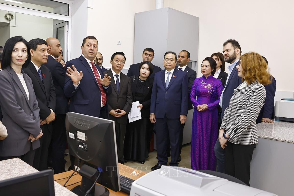 Chủ tịch Quốc hội Trần Thanh Mẫn và Phu nhân thăm phòng thí nghiệm của Đại học Tổng họp Quốc gia Yerevan (4/4/2025). Ảnh: Doãn Tấn – TTXVN