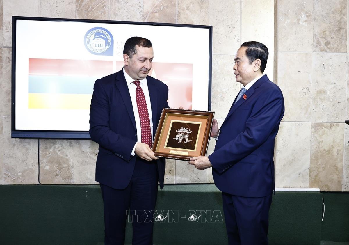 Chủ tịch Quốc hội Trần Thanh Mẫn tặng quà lưu niệm cho Đại học Tổng hợp Quốc gia Yerevan (4/4/2025). Ảnh: Doãn Tấn – TTXVN