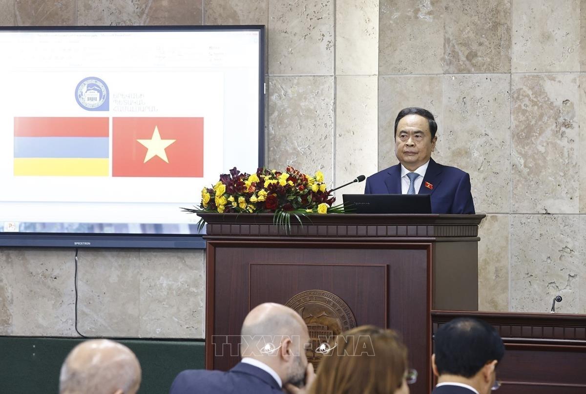 Chủ tịch Quốc hội Trần Thanh Mẫn phát biểu tại Đại học Tổng hợp Quốc gia Yerevan (4/4/2025). Ảnh: Doãn Tấn – TTXVN