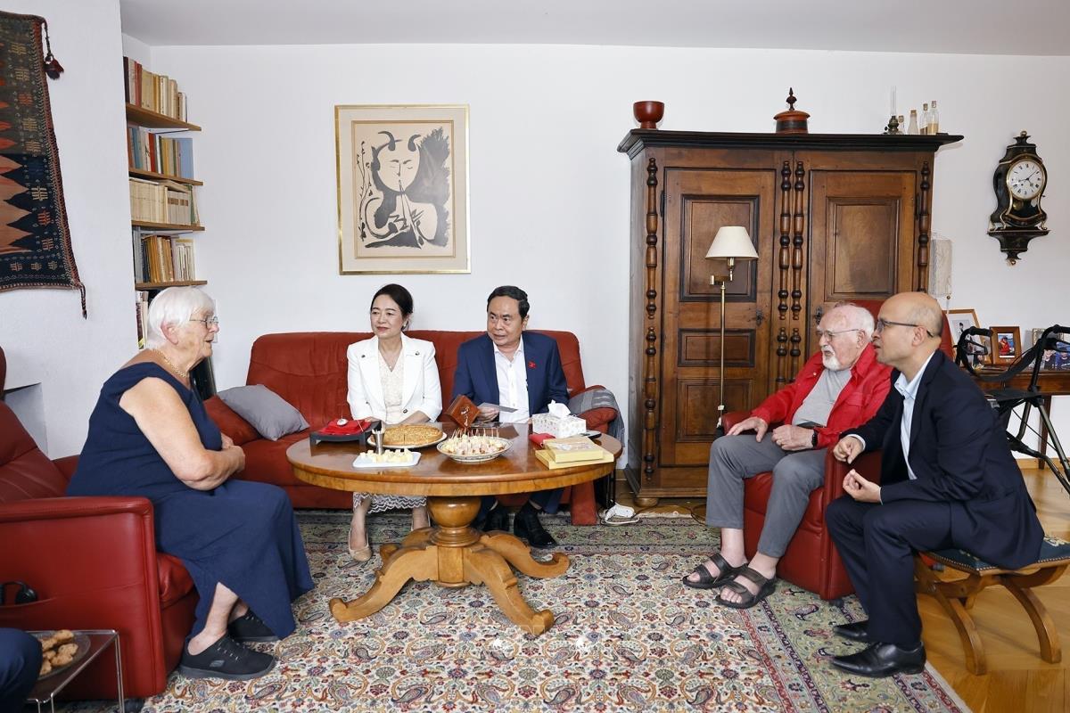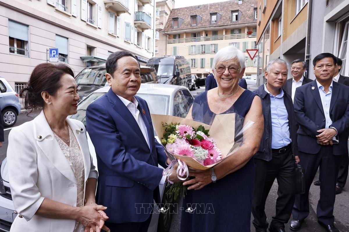 Chủ tịch Quốc hội Trần Thanh Mẫn và Phu nhân Nguyễn Thị Thanh Nga đến thăm gia đình ông bà Jacques Savary ở thành phố Vevey, Thụy Sĩ (28/7/2025). Ảnh: Doãn Tấn – TTXVN
