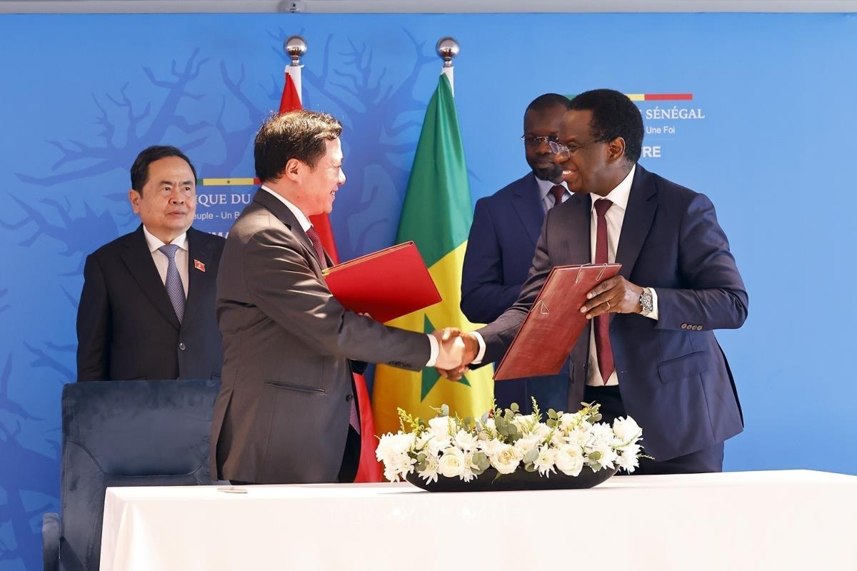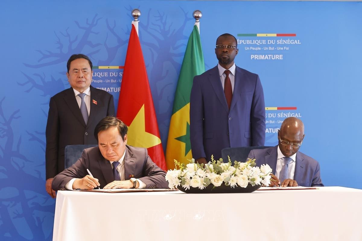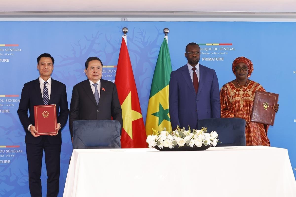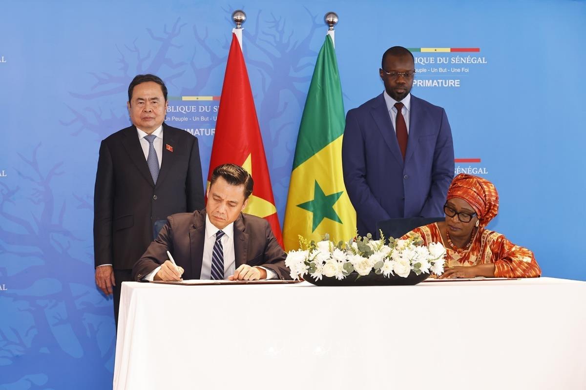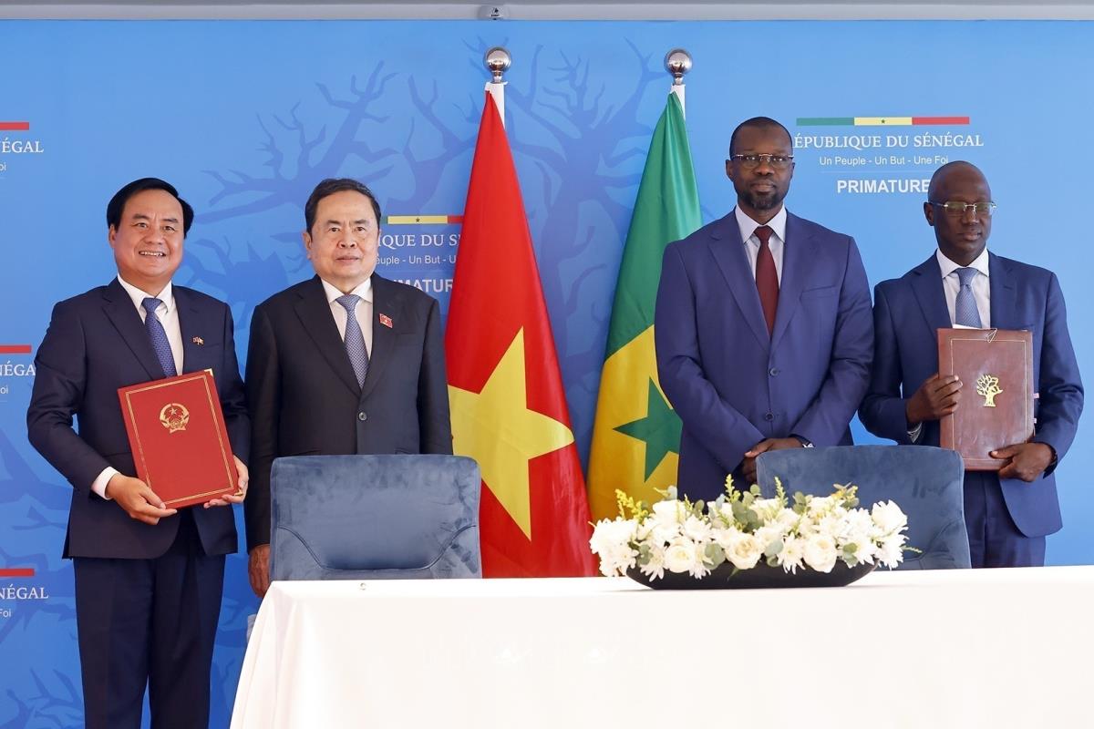 Hà Nội (TTXVN 24/7/2025) Trong khuôn khổ chuyến thăm chính thức Cộng hòa Senegal, chiều tối 23/7/2025, (theo giờ địa phương) tại thủ đô Dakar, Chủ tịch Quốc hội Trần Thanh Mẫn và Thủ tướng Senegal Ousmane Sonko chứng kiến các Bộ, ngành, địa phương 2 nước ký kết hợp tác.