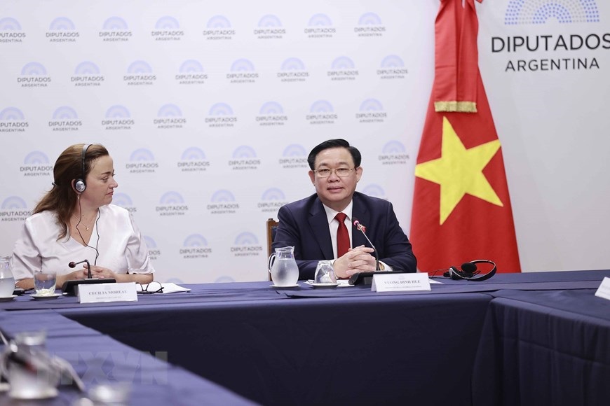 Hà Nội (TTXVN 24/4/2023) Trong khuôn khổ chuyến thăm chính thức Argentina (từ ngày 24 đến 27/4/2023), sáng 24/4/2023 (giờ địa phương), tại Trụ sở Quốc hội Argentina ở thủ đô Buenos Aires, Chủ tịch Quốc hội Vương Đình Huệ hội đàm với Chủ tịch Hạ viện Cộng hòa Argentina Cecilia Moreau.
