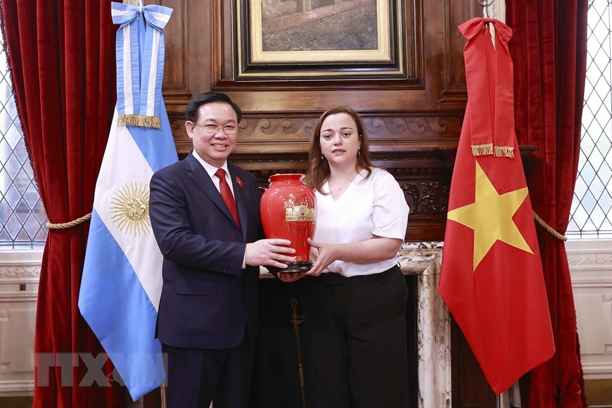 Chủ tịch Quốc hội Vương Đình Huệ và Chủ tịch Hạ viện Cộng hòa Argentina Cecilia Moreau trao đổi tặng phẩm. (Ảnh: Doãn Tấn/TTXVN)
